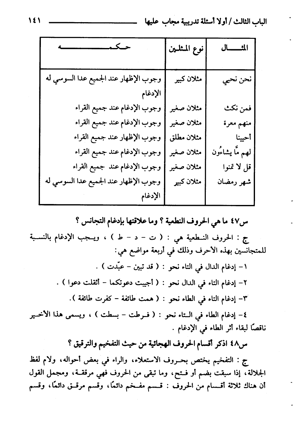 فمن نكث/ مثلان صغير/ وجوب الإدغام عند جميع القراء منهم معرة/ مثلان صغير/ وجوب الإدغام عند جميع القراء أحيينا/ مثلان مطلق/ وجوب الإظهار عند جميع القراء لهم ما يشاءون/ مثلان صغير/ وجوب الإدغام عند جميع القراء قل لا تمنوا/ مثلان صغير/ وجوب الإدغام عند جميع القراء شهر رمضان/ مثلان كبير/ وجوب الإظهار عند الجميع عدا السوسي له الإدغام س 47 ما هي الحروف النطعية؟ وما علاقتها بإدغام التجانس؟