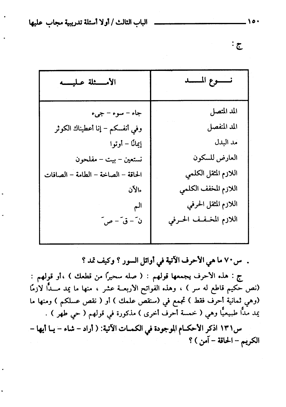 نوع المد/ الأمثلة عليه المد المتصل/ جاء - سوء - جىء المد المنفصل/ وفي أنفسكم - إنا أعطيناك الكوثر مد البدل/ إيمانا - أوتوا العارض للسكون/ نستعين - بيت - مفلحون اللازم المثقل الكلمي/ الحاقة - الصاخة - الطامة - الصافات اللازم المخفف الكلمي/ ءالآن اللازم المثقل الحرفي/ الم اللازم المخفف الحرفي/ ن - ق - ص س 70 ما هي الأحرف الآتية في أوائل السور؟ وكيف تمد؟