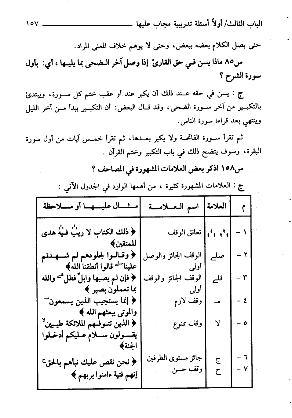 م/ العلامة/ اسم العلامة/ مثال عليها أو ملاحظة 1 - / ... / تعانق الوقف/ ذلِكَ الْكِتابُ لا رَيْبَ فِيهِ هُدىً لِلْمُتَّقِينَ 2 - / صلى/ الوقف الجائز والوصل أولى/ وَقالُوا لِجُلُودِهِمْ لِمَ شَهِدْتُمْ عَلَيْنا (صلى) قالُوا أَنْطَقَنَا اللَّهُ 3 - / قلى/ الوقف الجائز والوقف أولى/ فَإِنْ لَمْ يُصِبْها وابِلٌ فَطَلٌّ (قلى) وَاللَّهُ بِما تَعْمَلُونَ بَصِيرٌ 4 - م/ وقف لازم/ إِنَّما يَسْتَجِيبُ الَّذِينَ يَسْمَعُونَ وَالْمَوْتى يَبْعَثُهُمُ اللَّهُ 5 - / لا/ وقف ممنوع/ الَّذِينَ تَتَوَفَّاهُمُ الْمَلائِكَةُ طَيِّبِينَ يَقُولُونَ سَلامٌ عَلَيْكُمْ ادْخُلُوا الْجَنَّةَ 6 - / ج/ جائز مستوى الطرفين/ نَحْنُ نَقُصُّ عَلَيْكَ