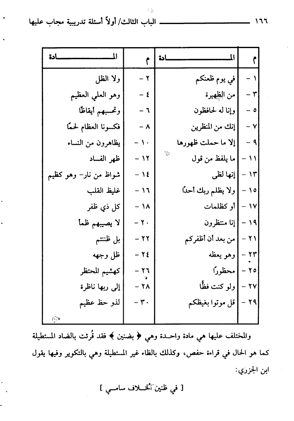 م/ المادة/ م/ المادة 1 - / في يوم ظعنكم 2 - / ولا الظل 3 - / من الظهيرة 4 - / وهو العلي العظيم 5 - / وإنا له لحافظون 6 - / وتحسبهم أيقاظا 7 - / إنك من المنظرين 8 - / فكسونا العظام لحما 9 - / إلا ما حملت ظهورها 10 - / يظاهرون من النساء 11 - / ما يلفظ من قول 12 - / ظهر الفساد 13 - / إنها لظى 14 - / شواظ من نار - وهو كظيم 15 - / ولا يظلم ربك أحدا 16 - / غليظ القلب 17 - / أو كظلمات 18 - / كل ذي ظفر 19 - / إنا منتظرون 20 - / لا يصيبهم ظمأ 21 - / من بعد أن أظفركم 22 - / بل ظننتم 23 - / وهو يعظه 24 - / ظل وجهه 25 - / محظورا 26 - / كهشيم المحتظر 27 - / ولو كنت فظّا 28 - / إلى ربها ناظرة 29 - / قل موتوا بغيظكم 30 - / لذو حظ عظيم والمختلف عليها هي مادة واحدة وهي بِضَنِينٍ فقد قرئت بالضاد المستطيلة كما هو الحال في قراءة حفص، وكذلك بالظاء غير المستطيلة وهي بالتكوير وفيها يقول ابن الجزري: