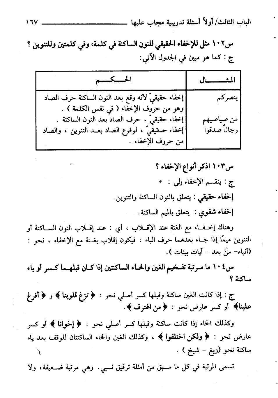 س 102 مثل للإخفاء الحقيقي للنون الساكنة في كلمة، وفي كلمتين وللتنوين؟