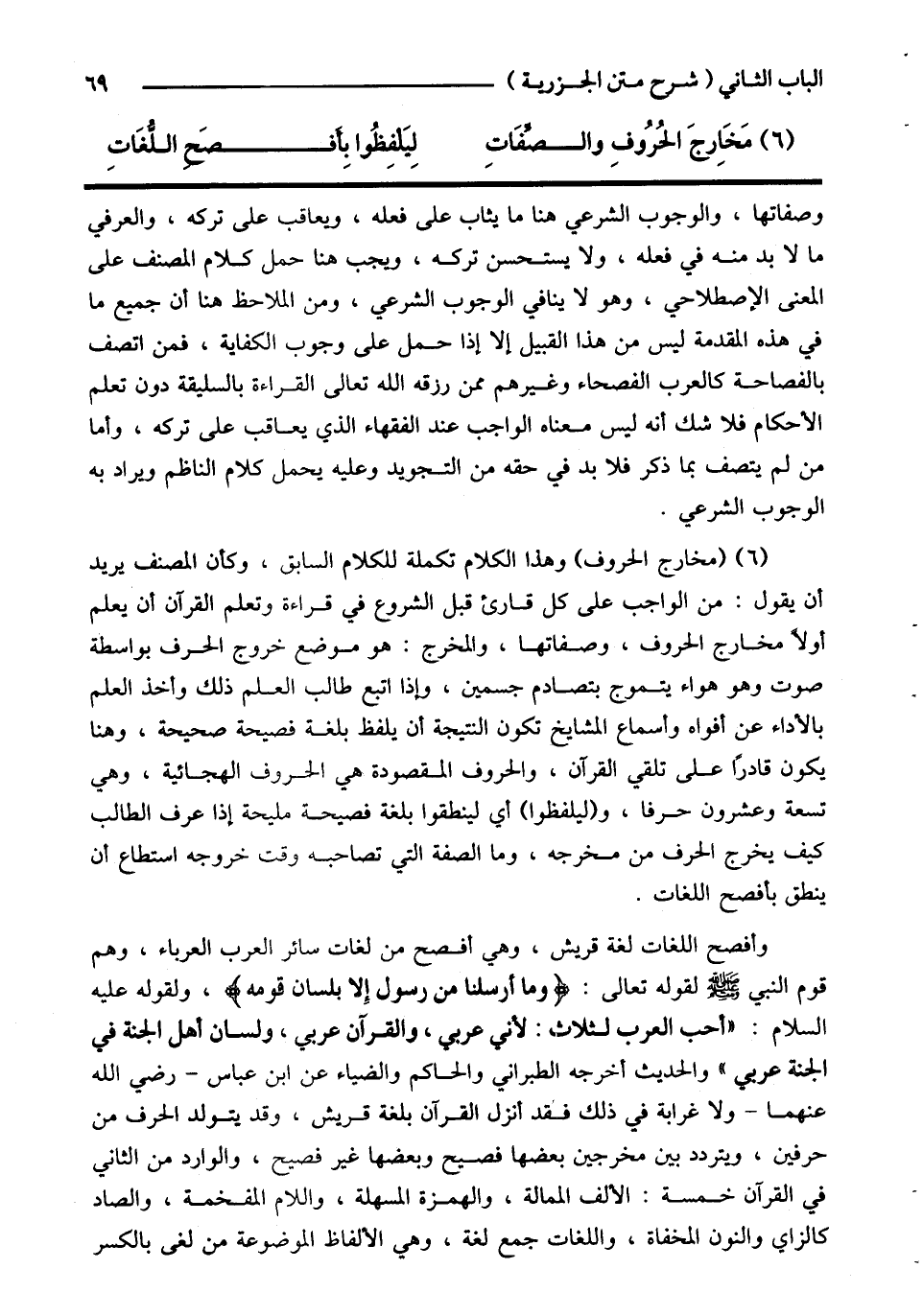 (6) (مخارج الحروف) وهذا الكلام تكملة للكلام السابق، وكأن المصنف يريد أن يقول: من الواجب على كل قارئ قبل الشروع في قراءة وتعلم القرآن أن يعلم أولا مخارج