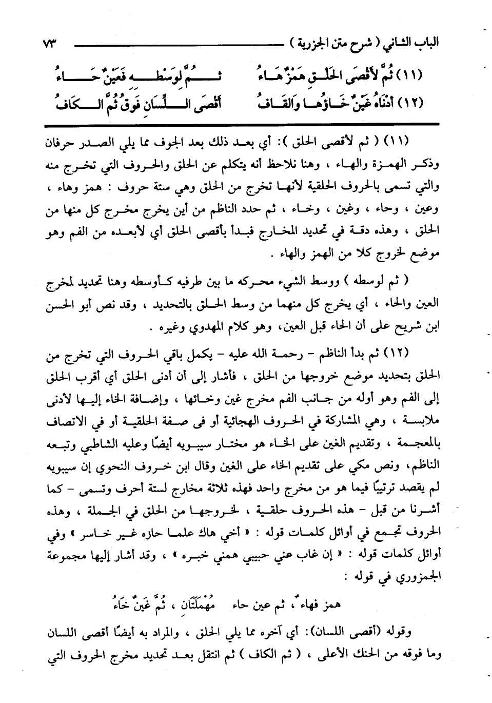 (11) (ثم لأقصى الحلق): أي بعد ذلك بعد الجوف مما يلي الصدر حرفان وذكر الهمزة والهاء، وهنا نلاحظ أنه يتكلم عن الحلق والحروف التي تخرج منه والتي تسمى بالحروف الحلقية لأنها تخرج من الحلق وهي ستة حروف: همز وهاء، وعين، وحاء، وغين، وخاء، ثم حدد الناظم من أين يخرج مخرج كل منها من الحلق، وهذه دقة في تحديد المخارج فبدأ بأقصى الحلق أي لأبعده من الفم وهو موضع لخروج كلا من الهمز والهاء.