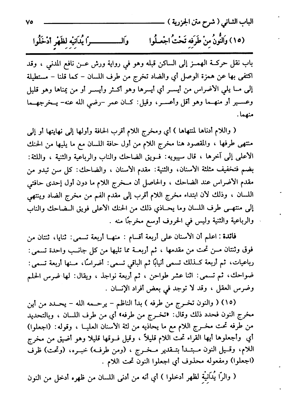 (15) (والنون تخرج من طرفه) بدأ الناظم - يرحمه الله - يحدد من أين مخرج النون فحدد ذلك وقال: «تخرج من طرفه» أي من طرف اللسان، وبالتحديد من طرفه تحت مخرج اللام مع ما يحاذيه من لثة الأسنان العليا، وقوله: (اجعلوا) أي واجعلوها أيها القراء تحت اللام قليلا، وقيل فوقها قليلا وهو أضيق من مخرج اللام، وقيل النون مبتدأ بتقدير مخرج، (ومن طرفه) خبره، (وتحت) ظرف (اجعلوا) ومفعوله محذوف أي اجعلوا النون تحت اللام.
