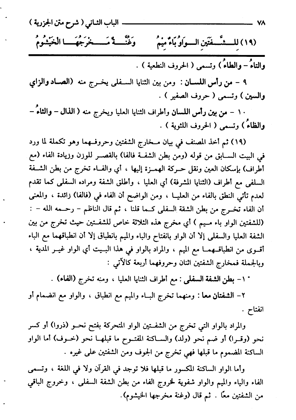 (19) ثم أخذ المصنف في بيان مخارج الشفتين وحروفهما وهو تكملة لما ورد في البيت السابق من قوله (ومن بطن الشفة فالفا) بالقصر للوزن وزيادة الفاء (مع أطراف) بإسكان العين ونقل حركة الهمزة إليها، أي والفاء تخرج من بطن الشفة السلفى مع أطراف (الثنايا المشرفة) أي العليا، وأطلق الشفة ومراده السفلى كما تقدم لعدم تأتي النطق بالفاء من العليا، ومن الواضح أن الفاء في (فالفا) زائدة، والمعنى أن الفاء تخرج من بطن الشقة السفلى كما قلنا، ثم قال الناظم - رحمه الله-: