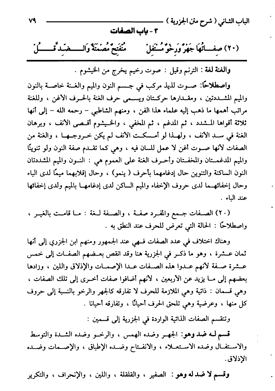 (20) الصفات جمع والمفرد صفة، والصفة لغة: ما قامت بالغير، واصطلاحا: الحالة التي تعرض للحرف عند النطق به.