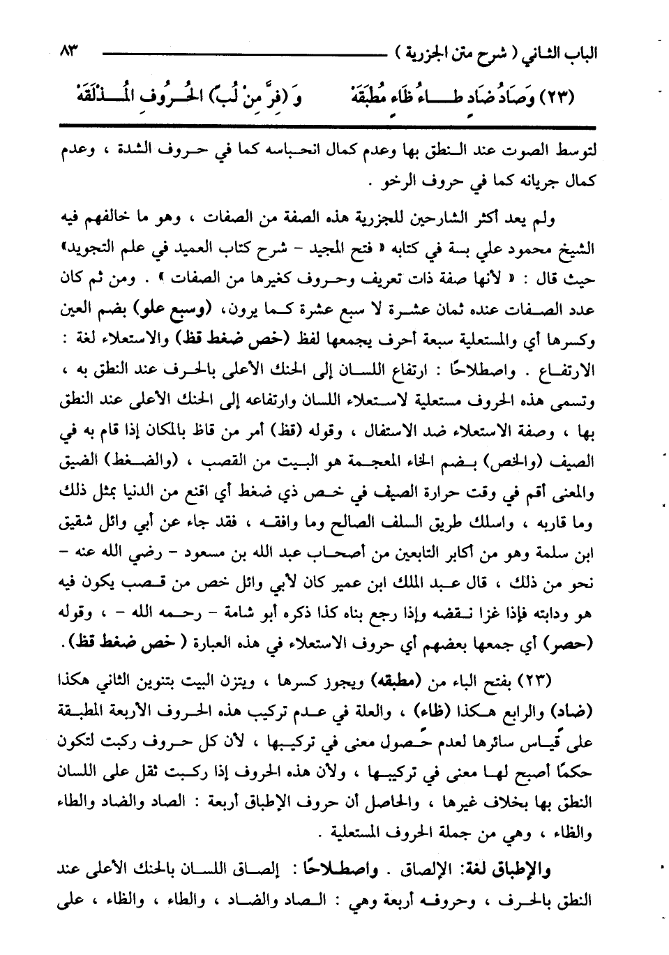 (23) وصاد ضاد طاء ظاء مطبقة ... و (فرّ من لبّ) الحروف المذلقة