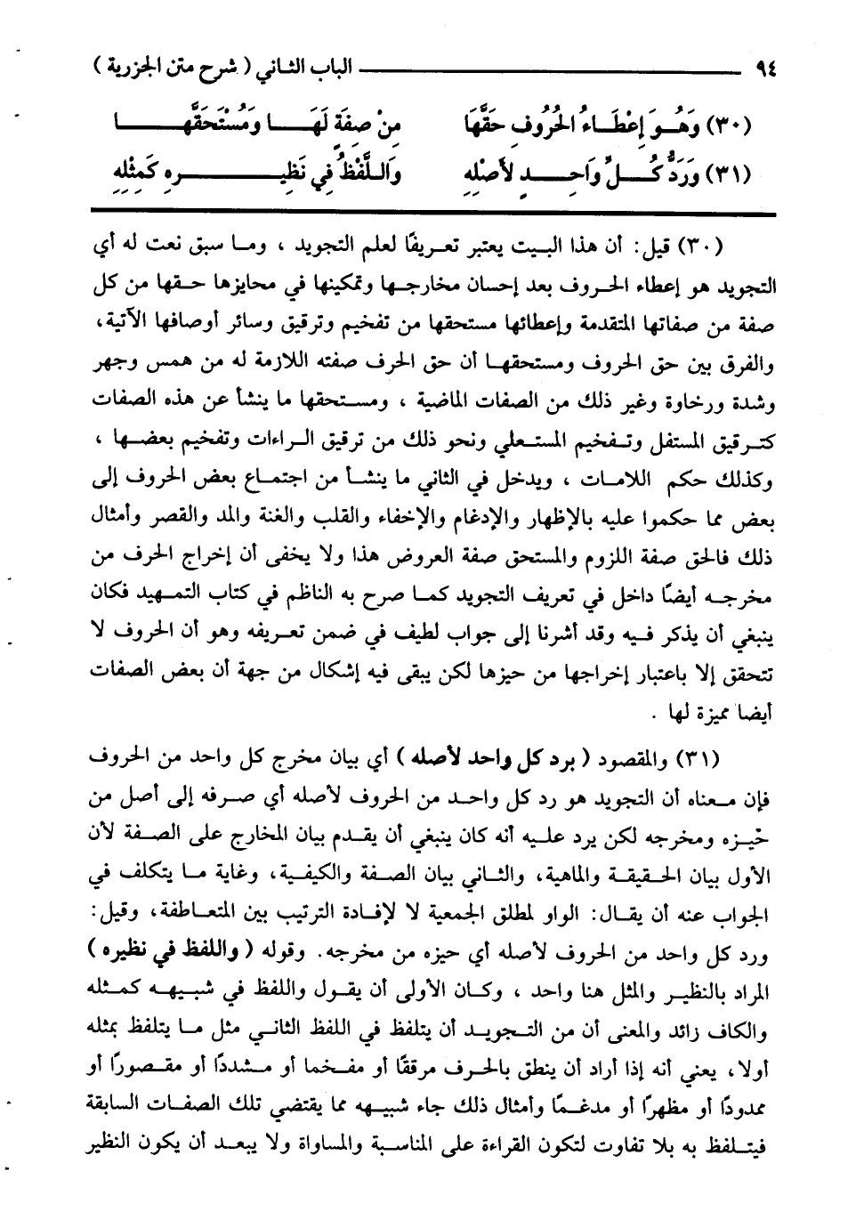 (30) قيل: أن هذا البيت يعتبر تعريفا لعلم التجويد، وما سبق نعت له أي التجويد هو إعطاء الحروف بعد إحسان مخارجها وتمكينها في محايزها حقها من كل صفة من صفاتها المتقدمة وإعطائها مستحقها من تفخيم وترقيق وسائر أوصافها الآتية، والفرق بين حق الحروف ومستحقها أن حق الحرف صفته اللازمة له من همس وجهر وشدة ورخاوة وغير ذلك من الصفات الماضية، ومستحقها ما ينشأ عن هذه الصفات كترقيق المستفل وتفخيم المستعلي ونحو ذلك من ترقيق الراءات وتفخيم بعضها، وكذلك حكم اللامات، ويدخل في الثاني ما ينشأ من اجتماع بعض الحروف إلى بعض مما حكموا عليه بالإظهار والإدغام والإخفاء والقلب والغنة والمد والقصر وأمثال