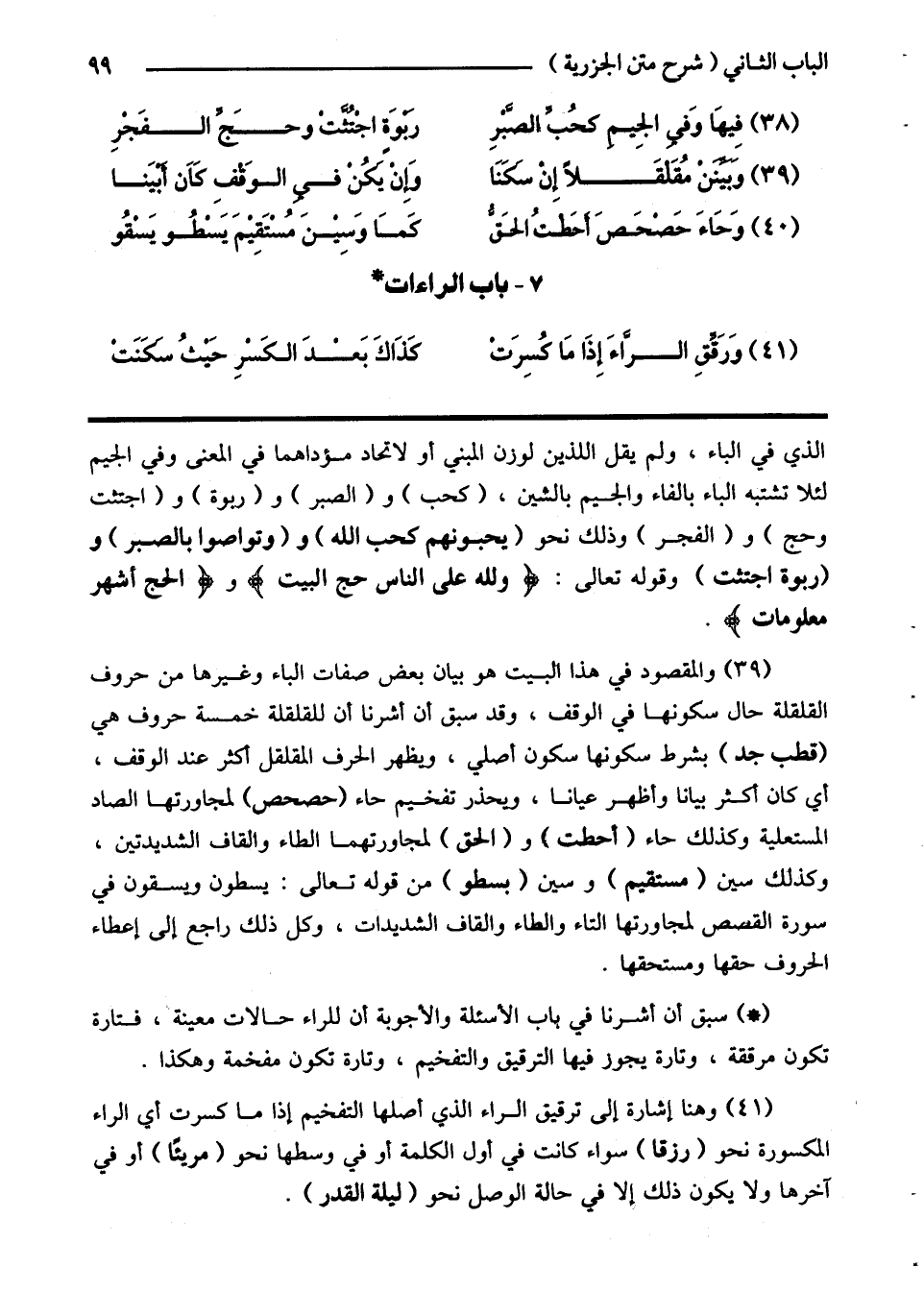 (39) والمقصود في هذا البيت هو بيان بعض صفات الباء وغيرها من حروف القلقلة حال سكونها في الوقف، وقد سبق أن أشرنا أن للقلقلة خمسة حروف هي (قطب جد) بشرط سكونها سكون أصلي، ويظهر الحرف المقلقل أكثر عند الوقف، أي كان أكثر بيانا وأظهر عيانا، ويحذر تفخيم حاء (حصحص) لمجاورتها الصاد المستعلية