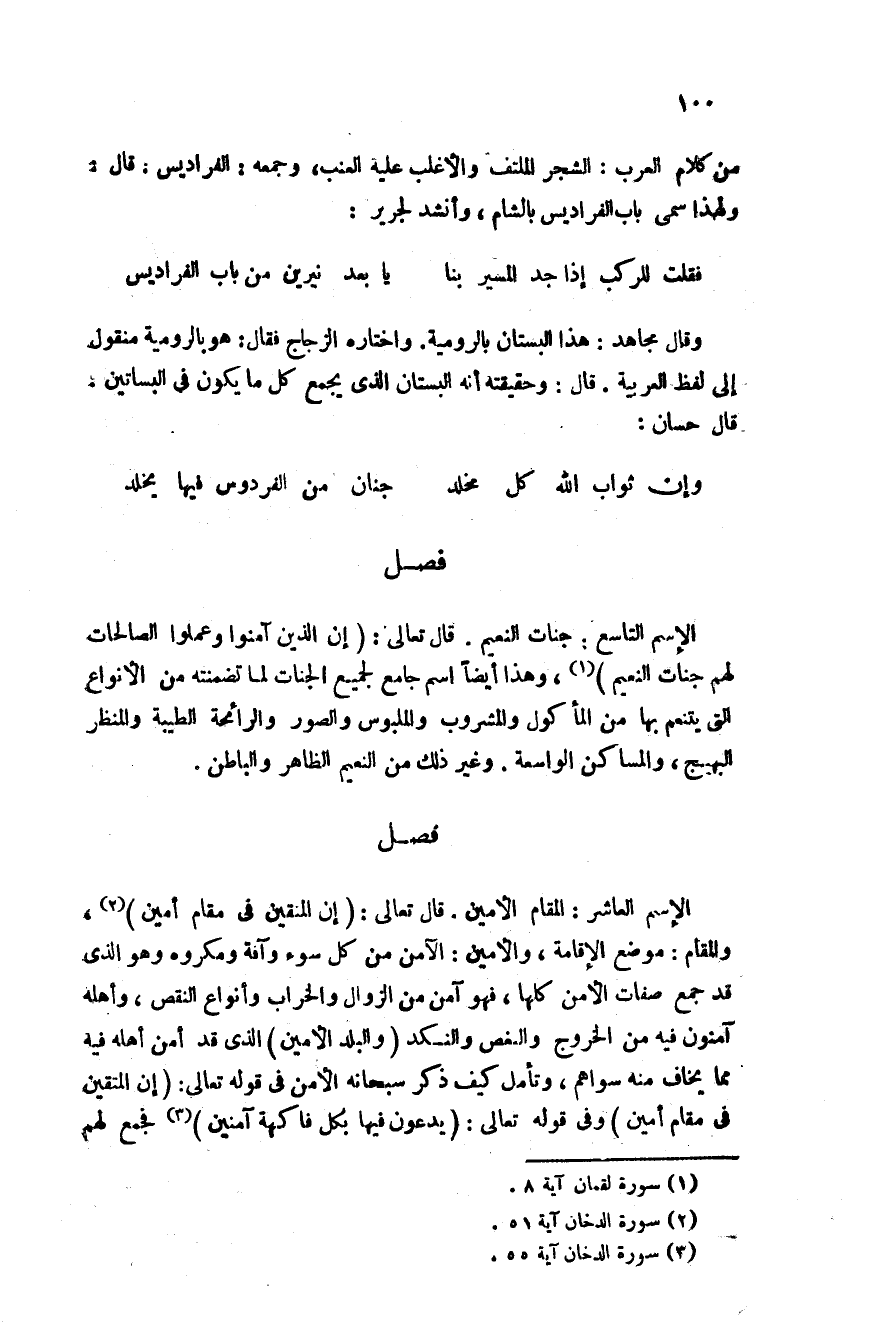 فصل الاسم العاشر: المقام الأمين قال تعالى {إِنَّ الْمُتَّقِينَ فِي مَقَامٍ أَمِينٍ فِي جَنَّاتٍ وَعُيُونٍ} والمقام الأمين موضع الإقامة والأمين الآمن من كل سوء وآفة ومكروه وهو الذي قد جمع صفات الأمن كلها فهو آمن من الزوال والخراب وأنواع النقص وأهله آمنون فيه من الخروج والنغص والنكد والبلد الأمين الذي قد أمن من أهله فيه مما يخالف منه سواهم وتأمل كيف ذكر سبحانه الأمن في قوله تعالى: {إِنَّ الْمُتَّقِينَ فِي مَقَامٍ أَمِينٍ} وفي قوله تعالى: {يَدْعُونَ فِيهَا بِكُلِّ فَاكِهَةٍ آمِنِينَ} فجمع لهم