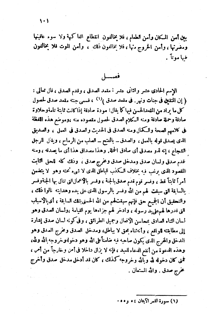 فصل الاسم الحادي عشر والثاني عشر مقعد الصدق وقدم الصدق قال تعالى: {إِنَّ الْمُتَّقِينَ فِي جَنَّاتٍ وَنَهَرٍ فِي مَقْعَدِ صِدْقٍ} فسمى الجنة مقعد صدق لحصول كل ما يراد من المقعد الحسن فيها كما يقال: مودة صادقة إذا كانت ثابتة تامة وحلاوة صادقة وجملة صادقة ومنه الكلام الصدق لحصول مقصوده منه وموضع هذه اللفظة في كلامهم الصحة والكمال ومنه الصدق في الحديث والصدق في العمل والصديق الذي يصدق قوله بالعمل والصدق بالفتح الصلب من الرماح ويقال للرجل الشجاع أنه لذو مصدق أي صادق الجملة وهذا مصداق هذا: أي ما يصدقه ومنه الصداقة لصفاء المودة والمخالة ومنه صدقني القتال وصدقني المودة ومنه قدم صدق ولسان صدق ومدخل صدق ومخرج صدق وذلك كله للحق الثابت المقصود الذي يرغب فيه بخلاف الكذب الباطل الذي لا شيء تحته ولا يتضمن أمرا ثابتا وفسر قوم قدم صدق بالجنة وفسر بالأعمال التي تنال بها الجنة وفسر بالسابقة التي سبقت لهم من الله وفسر بالرسول الذي على يده وهدايته نالوا ذلك والتحقيق أن الجميع حق فأنهم سبقت لهم من الله الحسنى بتلك السابقة أي بالأسباب التي قدرها لهم على يد رسوله وأدخر لهم جزاءها يوم لقائه ولسان الصدق وهو لسان الثناء الصادق بمحاسن الأفعال وجميل الطرائق وفي كونه لسان صدق إشارة إلى مطابقته للواقع وأنه ثناء بحق لا بباطل ومدخل الصدق ومخرج الصدق هو المدخل والمخرج الذي يكون صاحبه فيه ضامنا على الله وهو دخول وخروج بالله ولله وهذه الدعوة من أنفع الدعاء للعبد فإنه لا يزال داخلا في أمر وخارجا من أمر فمتى كان دخوله لله وبالله وخروجه كذلك كان قد أدخل مدخل صدق واخرج مخرج صدق والله المستعان.