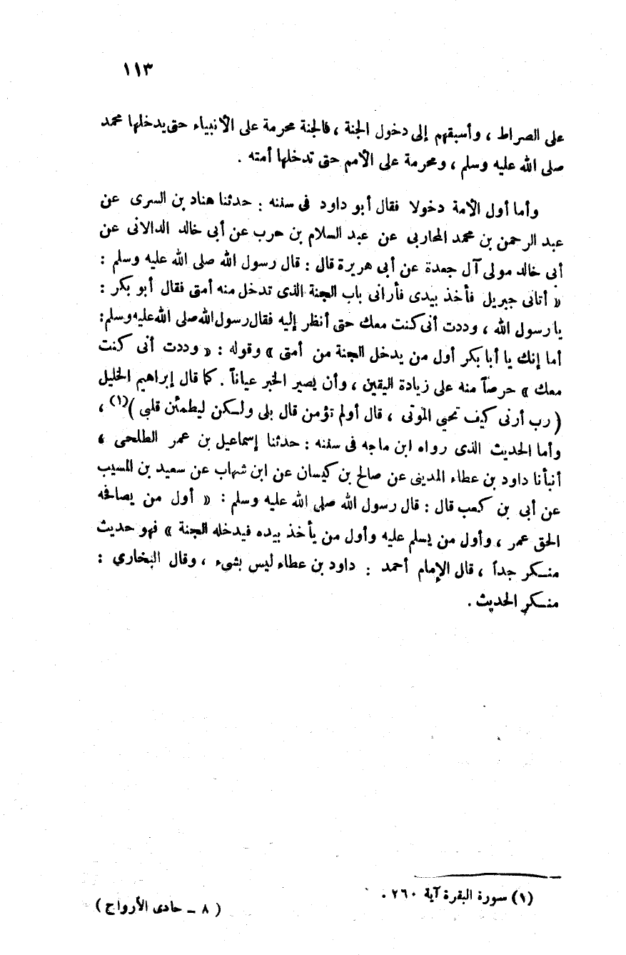 وأما أول الأمة دخولا فقال أبو داود في سننه حدثنا هناد بن السرى عن عبد الرحمن بن محمد المحاربي عن عبد السلام بن حرب عن أبي خالد الدالاني عن أبي خالد مولى آل جعدة عن أبي هريرة قال قال رسول الله صلى الله عليه وسلم: "أتاني جبريل فأخذ بيدي فأراني باب الجنة الذي تدخل منه أمتي " فقال أبو بكر: يا رسول الله صلى الله عليه وسلم وددت أني كنت معك حتى أنظر إليه فقال رسول الله صلى الله عليه وسلم: "أما إنك يا أبا بكر أول من يدخل الجنة من أمتي".