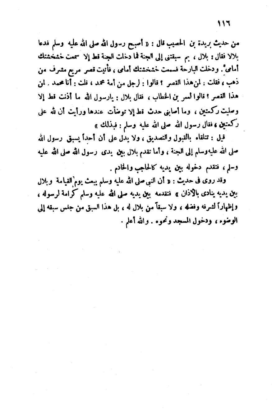 من حديث بريدة بن الحصيب قال: أصبح رسول الله صلى الله عليه وسلم فدعا بلال فقال: "يا بلال بم سبقتني إلى الجنة فما دخلت الجنة قط إلا سمعت خشخشتك أمامي ودخلت البارحة فسمعت خشخشتك أمامي فأتيت على قصر مريع مشرف من ذهب فقلت لمن هذا القصر قالوا: لرجل من عربي قلت: أنا عربي لمن هذا القصر؟ قالوا: لرجل من قريش, قلت: أنا قرشي ولمن هذا القصر؟ قالوا: لرجل من أمة محمد قلت أنا محمد لمن هذا القصر قالوا لعمر ابن الخطاب فقال بلال يا رسول الله صلى الله عليه وسلم ما أذنت قط إلا وصليت ركعتين وما أصابني حدث قط إلا توضأت عندها ورأيت أن لله على ركعتين فقال رسول الله صلى الله عليه وسلم: " بهما".