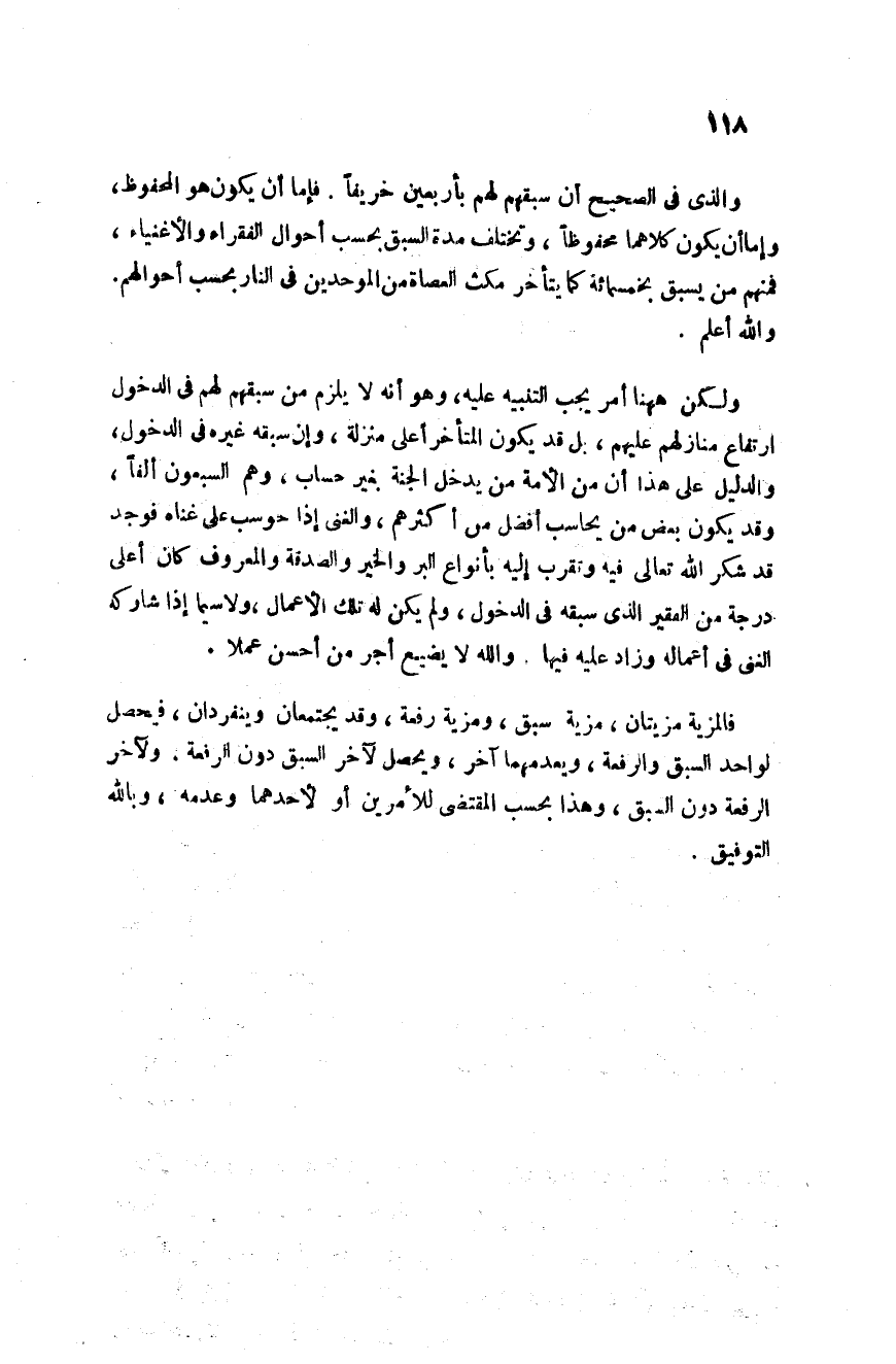 ولكن ها هنا أمر يجب التنبيه عليه وهو أنه لا يلزم من سبقهم لهم في الدخول ارتفاع منازلهم عليهم بل قد يكون المتأخر أعلى منزلة وأن سبقه غيره في الدخول والدليل على هذا أن من الأمة من يدخل الجنة بغير حساب وهم السبعون ألفا وقد يكون بعض من يحاسب أفضل من أكثرهم والغني إذا حوسب على غناه فوجد قد شكر الله تعالى فيه وتقرب إليه بأنواع البر والخير والصدقة والمعروف كان أعلى درجة من الفقير الذي سبقه في الدخول ولم يكن له تلك الأعمال ولا سيما إذا شاركه الغني في أعماله وزاد عليه فيها والله لا يضيع أجر من أحسن عملا