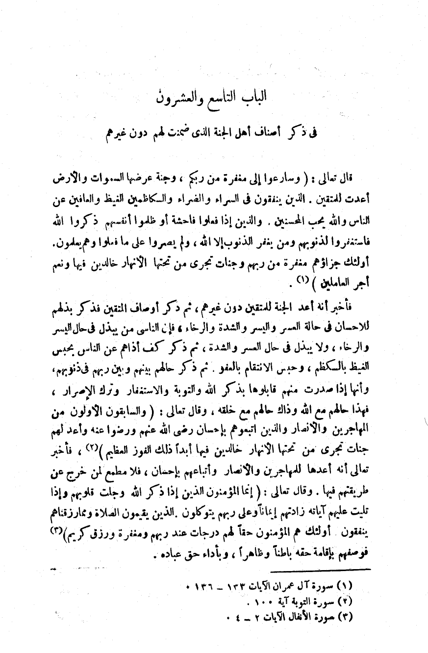 قال تعالى: {وَسَارِعُوا إِلَى مَغْفِرَةٍ مِنْ رَبِّكُمْ وَجَنَّةٍ عَرْضُهَا السَّمَاوَاتُ وَالأَرْضُ أُعِدَّتْ لِلْمُتَّقِينَ الَّذِينَ يُنْفِقُونَ فِي السَّرَّاءِ وَالضَّرَّاءِ وَالْكَاظِمِينَ الْغَيْظَ وَالْعَافِينَ عَنِ النَّاسِ وَاللَّهُ يُحِبُّ الْمُحْسِنِينَ أَنْفُسَهُمْ ذَكَرُوا اللَّهَ فَاسْتَغْفَرُوا لِذُنُوبِهِمْ وَمَنْ يَغْفِرُ الذُّنُوبَ إِلاَّ اللَّهُ وَلَمْ يُصِرُّوا عَلَى مَا فَعَلُوا وَهُمْ يَعْلَمُونَ أُولَئِكَ جَزَاؤُهُمْ مَغْفِرَةٌ مِنْ رَبِّهِمْ وَجَنَّاتٌ تَجْرِي مِنْ تَحْتِهَا الْأَنْهَارُ خَالِدِينَ فِيهَا وَنِعْمَ أَجْرُ الْعَامِلِينَ} فأخبر أنه أعد الجنة للمتقين دون غيرهم ثم ذكر أوصاف المتقين فذكر بذلهم للإحسان في حالة العسر واليسر والشدة والرخاء فإن من الناس من يبذل في حال اليسر والرخاء ولا يبذل في حال العسر والشدة ثم ذكر كيف أذاهم عن الناس بحبس الغيظ بالكظم وحبس الانتقام بالعفو ثم ذكر حالهم بينهم وبين ربهم في ذنوبهم وأنها إذا صارت منهم قابلوها بذكر الله والتوبة والاستغفار وترك الإضرار فهذا حالهم مع الله وذاك حالهم مع خلقه وقال تعالى: {وَالسَّابِقُونَ الأَوَّلُونَ مِنَ الْمُهَاجِرِينَ وَالأَنْصَارِ وَالَّذِينَ اتَّبَعُوهُمْ بِإِحْسَانٍ رَضِيَ اللَّهُ عَنْهُمْ وَرَضُوا عَنْهُ وَأَعَدَّ لَهُمْ جَنَّاتٍ تَجْرِي تَحْتَهَا الْأَنْهَارُ خَالِدِينَ فِيهَا أَبَداً ذَلِكَ الْفَوْزُ الْعَظِيمُ} فأخبر تعالى أنه أعدها للمهاجرين والأنصار وأتباعهم بإحسان فلا مطمع لمن خرج عن طريقتهم فيها وقال تعالى: {إِنَّمَا الْمُؤْمِنُونَ الَّذِينَ إِذَا ذُكِرَ اللَّهُ وَجِلَتْ قُلُوبُهُمْ وَإِذَا تُلِيَتْ عَلَيْهِمْ آيَاتُهُ زَادَتْهُمْ إِيمَاناً وَعَلَى رَبِّهِمْ يَتَوَكَّلُونَ الَّذِينَ يُقِيمُونَ الصَّلاةَ وَمِمَّا رَزَقْنَاهُمْ يُنْفِقُونَ أُولَئِكَ هُمُ الْمُؤْمِنُونَ حَقّاً لَهُمْ دَرَجَاتٌ عِنْدَ رَبِّهِمْ وَمَغْفِرَةٌ وَرِزْقٌ كَرِيمٌ} فوصفهم بإقامة حقه باطنا وظاهرا وبأداء حق عباده