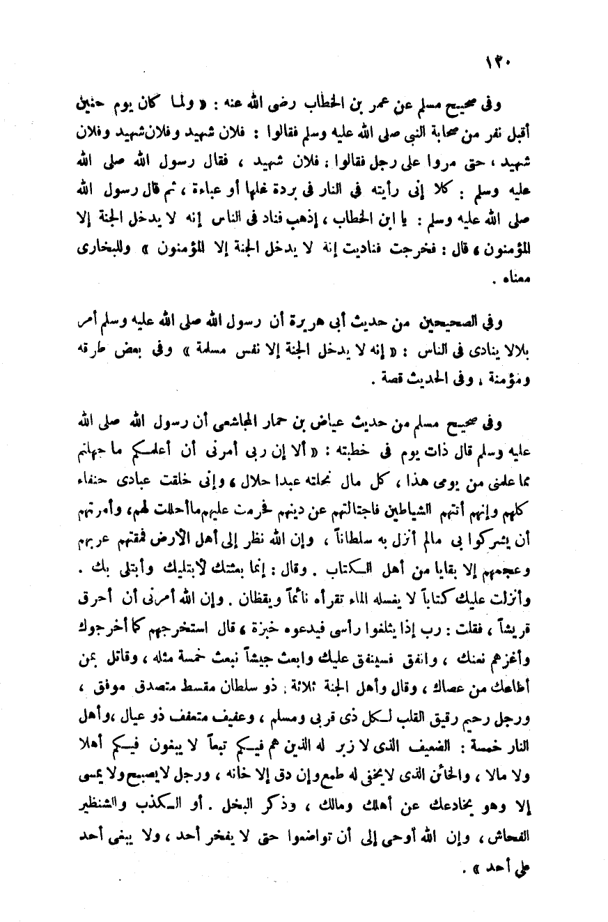 وفي صحيح مسلم من حديث عياض بن حمار المجاشعى أن رسول الله صلى الله عليه وسلم قال ذات يوم في خطبته: "ألا إن ربي أمرني أن أعلمكم ما جهلتم مما علمني من يومي هذا كل مال نحلته عبد حلال وإني خلقت عبادي حنفاء كلهم وإنهم أتتهم الشياطين فاجتالتهم عن دينهم فحرمت عليهم ما أحللت لهم وأمرتهم أن يشركوا بي ما لم أنزل به سلطانا وإن الله نظر إلى أهل الأرض فمقتهم عربهم وعجمهم إلا بقايا من أهل الكتاب وقال: "إنما بعثتك لأبتليك وأبتلي بك وأنزلت عليك كتابا لا يغسله الماء تقرأه نائما ويقظان وإن الله أمرني أن أحرق قريشا فقلت: رب إذا يثلغوا رأسي فيدعوه خبزة قال: استخرجهم كما أخرجوك واغزهم نغزك وأنفق فسينفق عليك وأبعث جيشا نبعث خمسة مثله وقاتل بمن أطاعك من عصاك قال وأهل الجنة ثلاثة ذو سلطان مقسط متصدق موفق ورجل رحيم رقيق القلب لكل ذي قربى ومسلم وعفيف متعفف ذو عيال وأهل النار خمسة الضعيف الذي لا زير له الذين هم فيكم تبعا لا يبغون فيكم أهلا ولا مال والخائن الذي لا يخفى له طمع وإن دق إلا خانة ورجل لا يصبح ولا يمسى إلا وهو يخادعك عن أهلك ومالك وذكر البخل أو الكذب والشنظير الفحّاش وأن الله أوحى إلى أن تواضعوا حتى لا يفخر أحد على أحد ولا يبغي أحد على أحد".