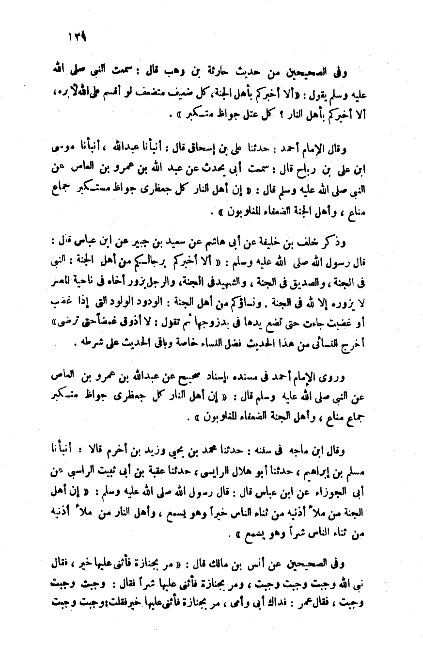 وروى الإمام أحمد في مسنده بإسناد صحيح عن عبد الله بن عمرو بن العاص عن النبي صلى الله عليه وسلم قال: "أن أهل النار كل جعظري جواظ متكبر جماع مناع وأهل الجنة الضعفاء المغلوبون".