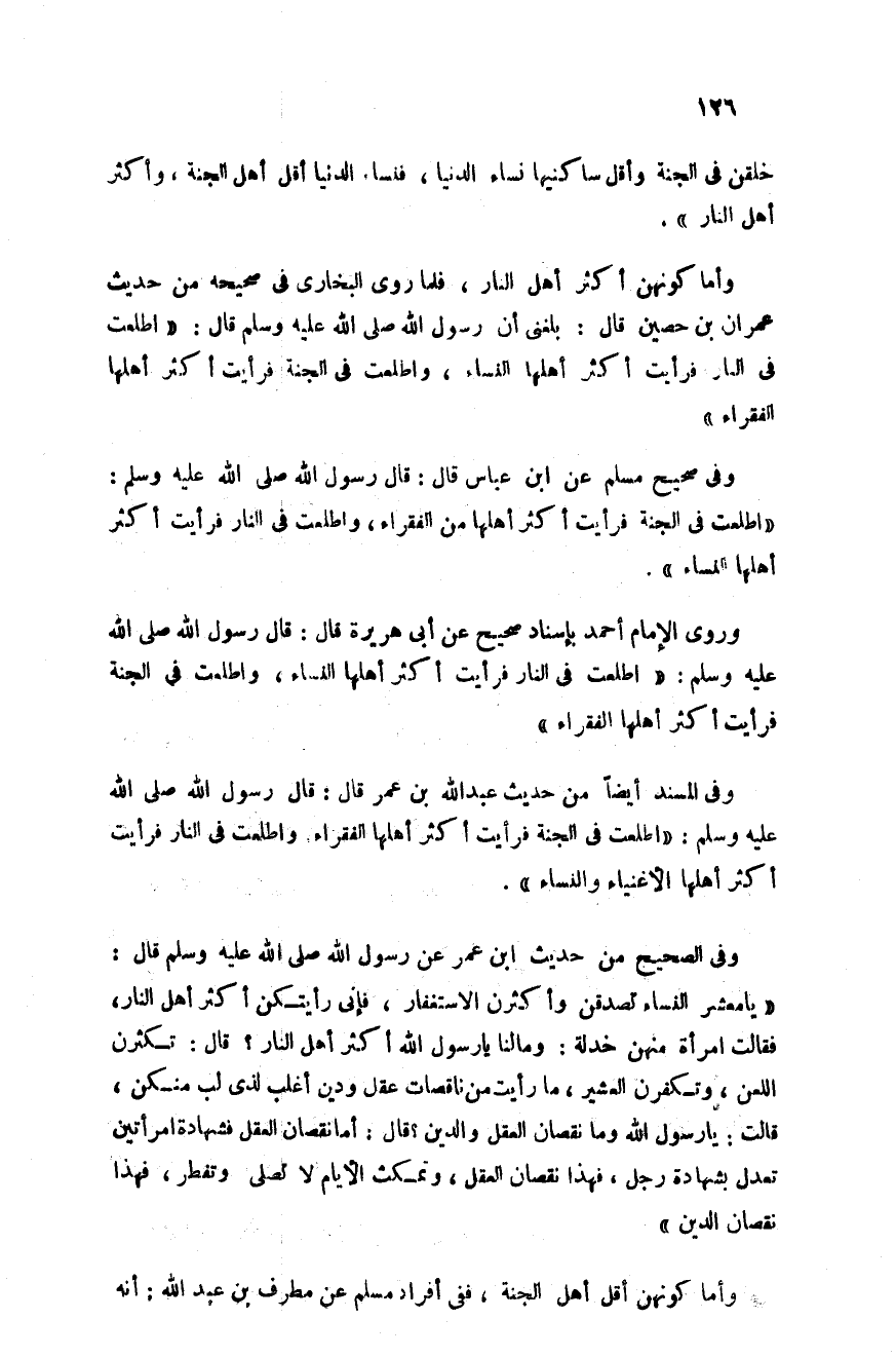 وروى الإمام أحمد بإسناد صحيح عن أبي هريرة قال قال رسول الله صلى الله عليه وسلم "اطلعت في النار فرأيت أكثر أهلها النساء واطلعت في الجنة فرأيت أكثر أهلها الفقراء"