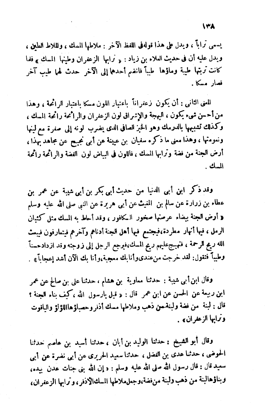 وقال ابن أبي شيبة: حدثنا معاوية ابن هشام حدثنا علي بن صالح عن عمر بن ربيعة عن الحسن عن ابن عمر قال: قيل يا رسول الله صلى الله عليه وسلم كيف بناء الجنة؟ قال: "لبنة من فضة ولبنة من ذهب وملاطها مسك أذفر وحصباؤها اللؤلؤ والياقوت وترابها الزعفران"