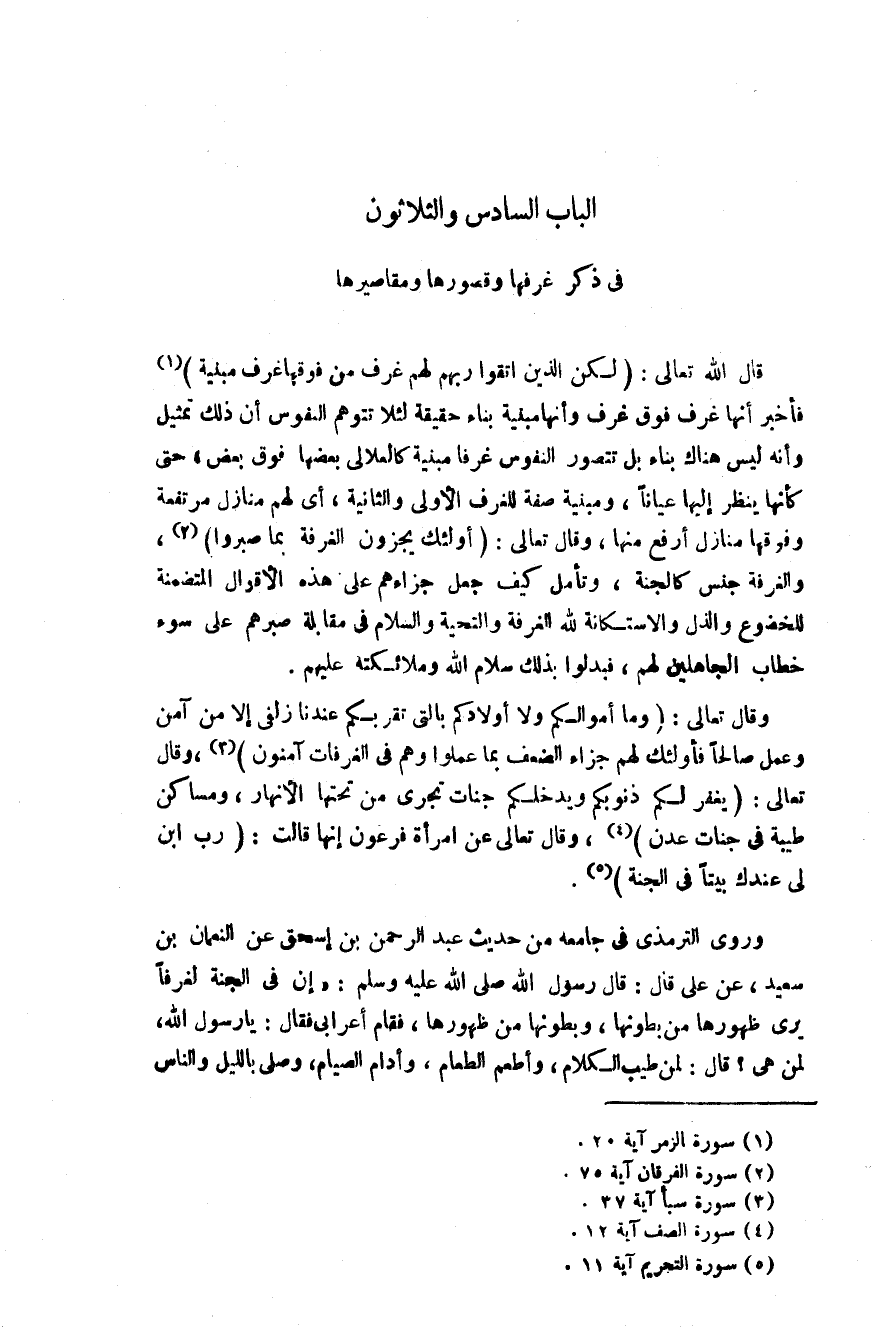 قال الله تعالى: {لَكِنِ الَّذِينَ اتَّقَوْا رَبَّهُمْ لَهُمْ غُرَفٌ مِنْ فَوْقِهَا غُرَفٌ مَبْنِيَّةٌ} فأخبر تعالى أنها غرف فوق غرف وأنها مبنية بناء حقيقة لئلا تتوهم النفوس أن ذلك تمثيل وأنه ليس هناك بناء بل تتصور النفوس غرفا مبنية كالعلالي بعضها فوق بعض حتى كأنها ينظر إليها عيانا ومبنية صفة للغرف الأولى والثانية أي لهم منازل مرتفعة وفوقها منازل أرفع منها قال تعالى: {أُولَئِكَ يُجْزَوْنَ الْغُرْفَةَ بِمَا صَبَرُوا} والغرفة جنس كالجنة وتأمل كيف جزاءهم على هذه الأقوال المتضمنة للخضوع والذل والاستكانة لله الغرفة والتحتية والسلام في مقابلة صبرهم على سوء خطاب الجأهلين لهم فبدلوا بذلك سلام الله وملائكته عليهم.