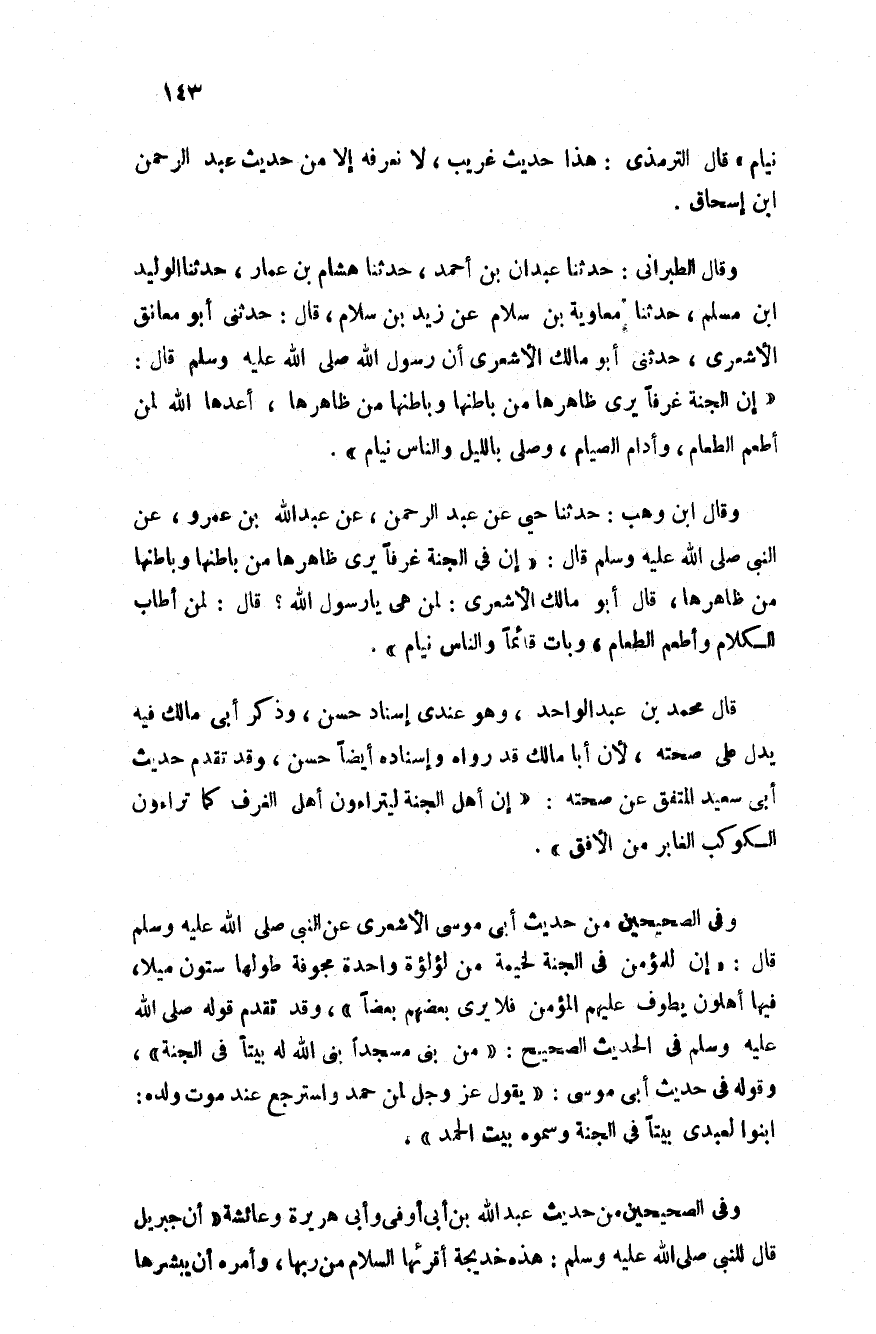وقال ابن وهب حدثنا حيي عن عبد الرحمن عن عبد الله بن عمرو عن النبي صلى الله عليه وسلم قال: "إن في الجنة غرفا يرى ظاهرها من باطنها وباطنها من ظاهرها" قال أبو مالك الأشعري لمن هي يا رسول الله صلى الله عليه وسلم قال: "لمن أطاب الكلام وأطعم الطعام وبات قائما والناس نيام"