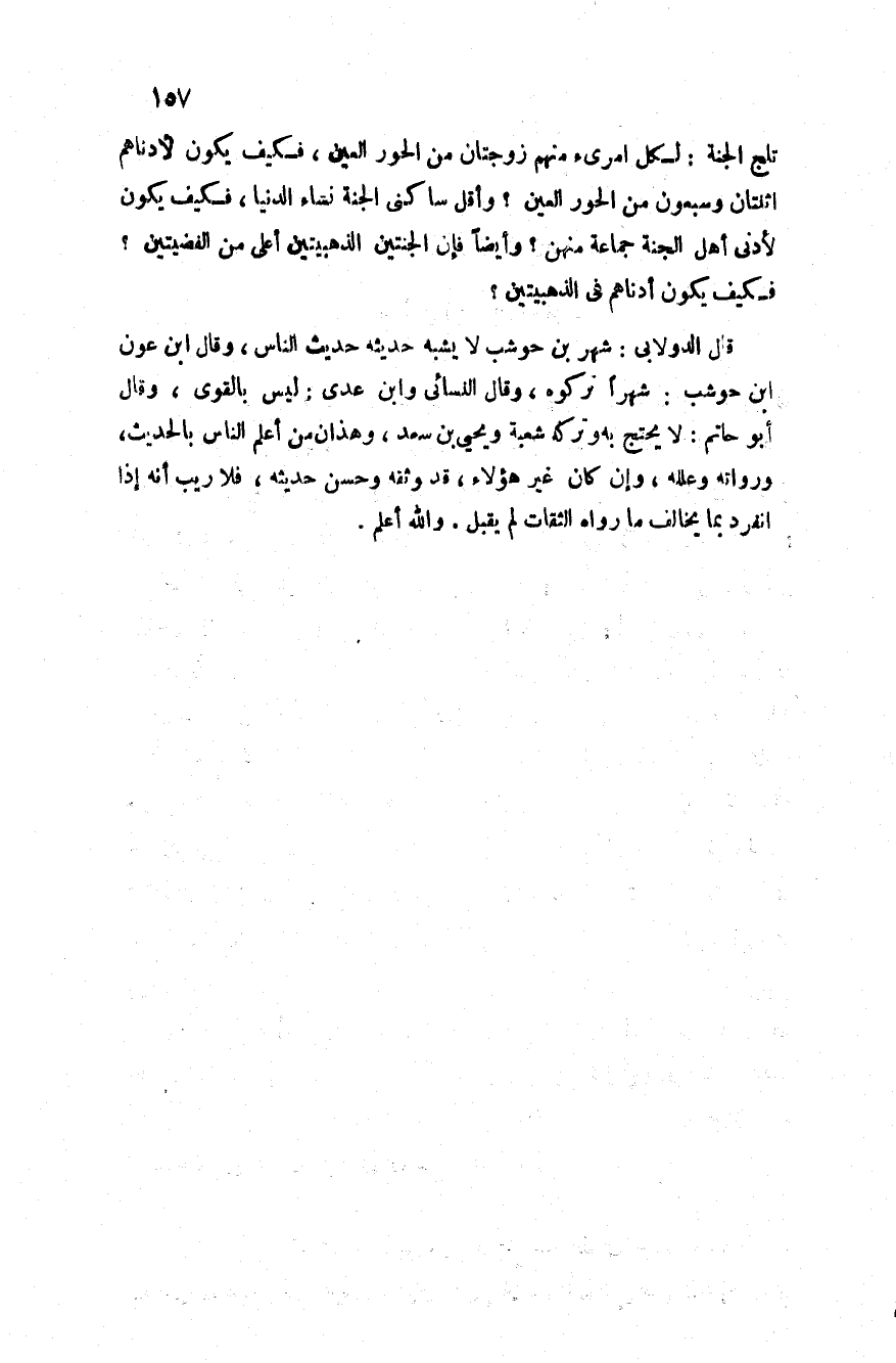 قال الدولابي: شهر بن حوشب لا يشبه حديثه الناس وقال ابن عون: حوشب شهرا تركوه وقال النسائي وابن عدي: ليس بالقوي وقال أبو حاتم لا يحتج به وتركه شعبة ويحيى بن سعيد وهذان من أعلم الناس بالحديث ورواته وعلله وأن كان غير هؤلاء قد وثقه وحسن حديثه فلا ريب أنه إذا انفرد بما يخالف ما رواه الثقات لم يقبل والله أعلم.