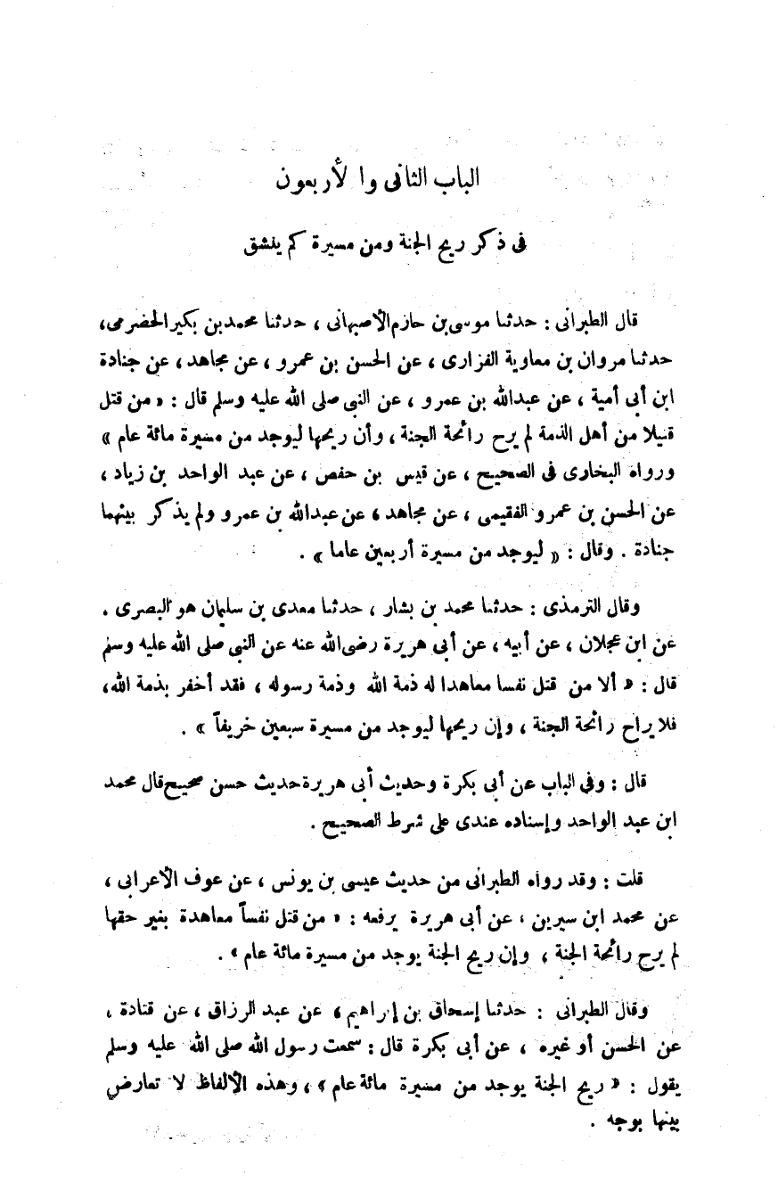 قال الطبراني حدثنا موسى بن حازم الأصبهاني حدثنا محمد بن بكير الحضرمي حدثنا مروان بن معاوية الفزاري عن الحسن بن عمرو عن مجاهد عن جنادة بن أبي أمية عن عبد الله بن عمرو عن النبي صلى الله عليه وسلم قال: "من قتل قتيلا من أهل الذمة لم يرح رائحة الجنة وأن ريحها ليوجد من مسيرة مائة عام" ورواه البخاري في الصحيح عن قيس بن حفص عن عبد الواحد بن زياد عن الحسن ابن عمرو الفقيمي عن مجاهد عن عبد الله بن عمرو ولم يذكر بينهما جنادة وقال ليوجد من مسيرة أربعين عاما