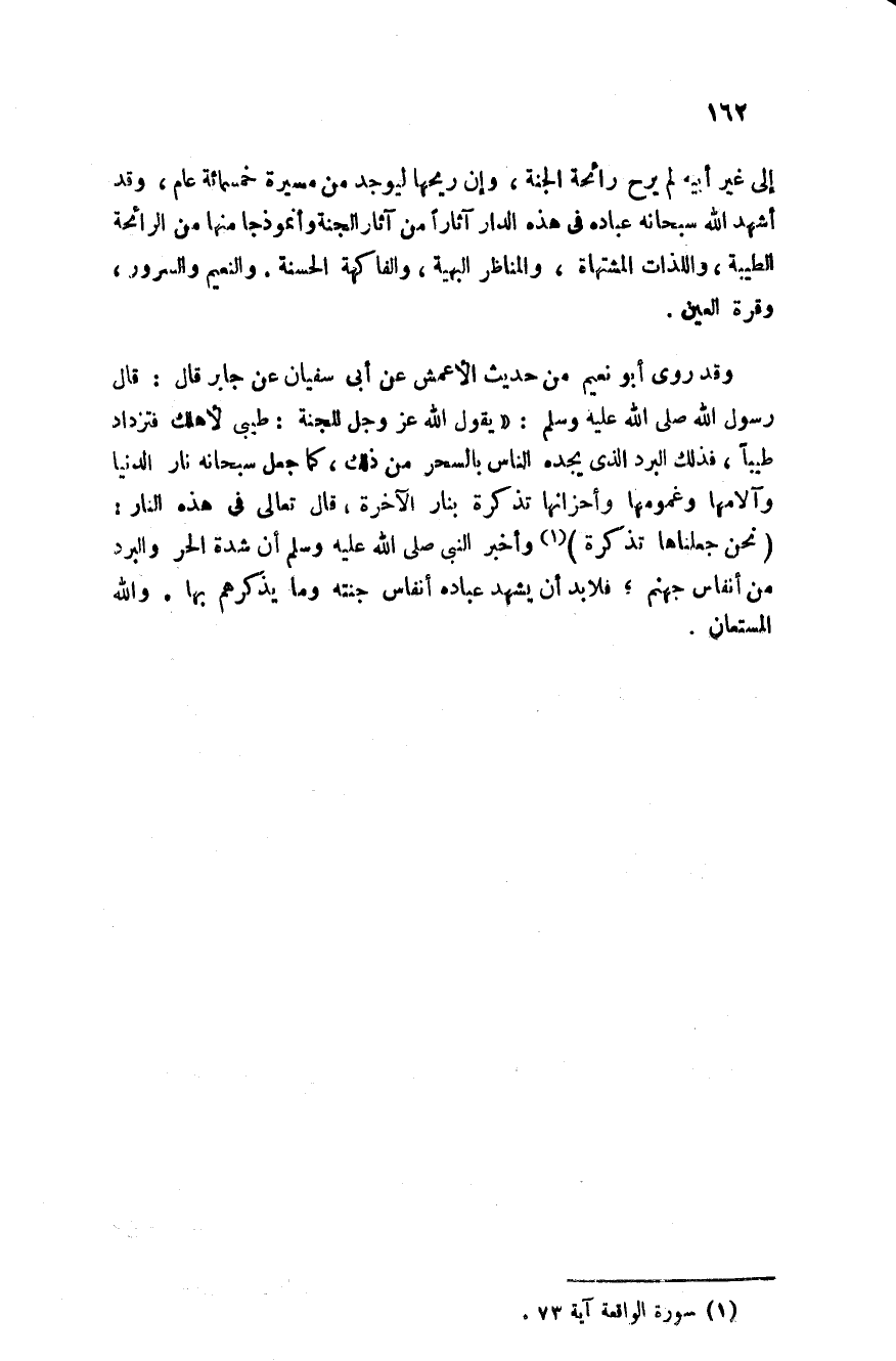 وقد روى أبو نعيم من حديث الأعمش عن أبي سفيان عن جابر قال قال رسول الله صلى الله عليه وسلم: " يقول الله عز وجل للجنة: طيبى لأهلك فتزداد طيبا فذلك البرد الذي يجده الناس بالسحر من ذلك كما جعل سبحانه نار الدنيا وآلامها وغمومها وأحزانها تذكرة بنار الآخرة قال تعالى في هذه النار: {نَحْنُ جَعَلْنَاهَا تَذْكِرَةً} وأخبر النبي صلى الله عليه وسلم: "أن شدة الحر والبرد من أنفاس جهنم فلا بد أن يشهد عباده جنته وما يذكرهم بها" والله المستعان.