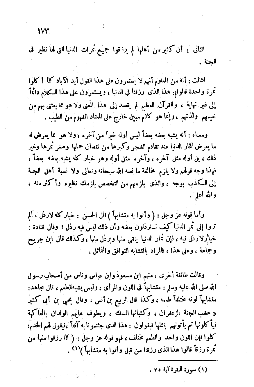 وقالت طائفة أخرى منهم ابن مسعود وابن عباس وناس من أصحاب رسول الله صلى الله عليه وسلم متشابها في اللون والمرأى وليس يشبه الطعم قال مجاهد: متشابها لونه مختلفا طعمه وكذا قال الربيع بن أنس وقال يحيى بن أبي كثير عشب الجنة الزعفران وكثبانها المسك ويطوف عليهم الولدان بالفاكهة فيأكلونها ثم يأتونهم بمثلها فيقولون هذا الذي جئتمونا به آنفا فيقول لهم الخدم كلوا فإن اللون واحد والطعم مختلف فهو قوله عز وجل: {كُلَّمَا رُزِقُوا مِنْهَا مِنْ ثَمَرَةٍ رِزْقاً قَالُوا هَذَا الَّذِي رُزِقْنَا مِنْ قَبْلُ وَأُتُوا بِهِ مُتَشَابِهاً}