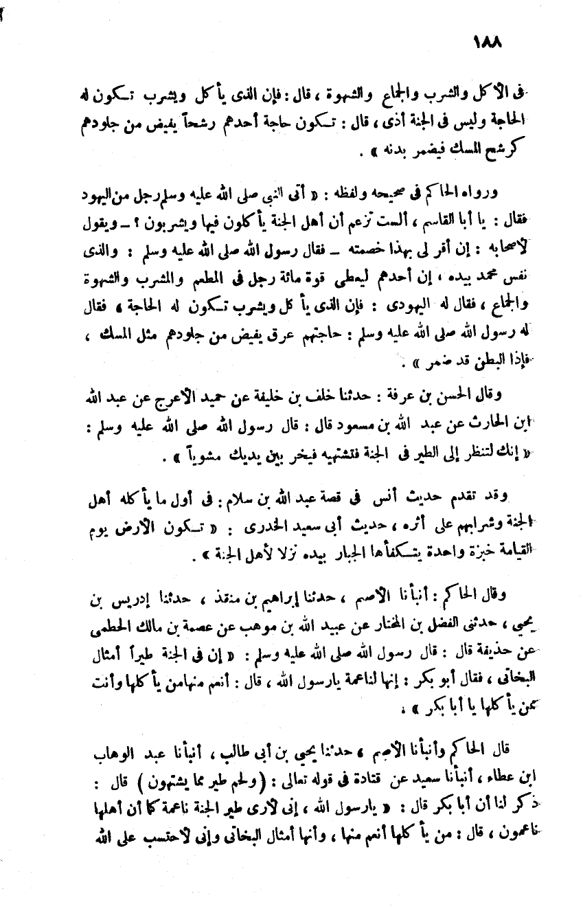 ورواه الحاكم في صحيحه ولفظه أتي النبي صلى الله عليه وسلم رجل من اليهود فقال: يا أبا القاسم ألست تزعم أن أهل الجنة يأكلون فيها ويشربون ويقول لأصحابه إن أقر لي بهذا خصمته فقال رسول الله صلى الله عليه وسلم: "بلى والذي نفس محمد بيده إن أحدهم ليعطي قوة مائة رجل في المطعم والمشرب والشهوة والجماع" فقال له اليهودي: فإن الذي يأكل ويشرب تكون له الحاجة فقال رسول الله صلى الله عليه وسلم: "حاجتهم عرق يفيض من جلودهم مثل المسك فإذا البطن قد ضمر"