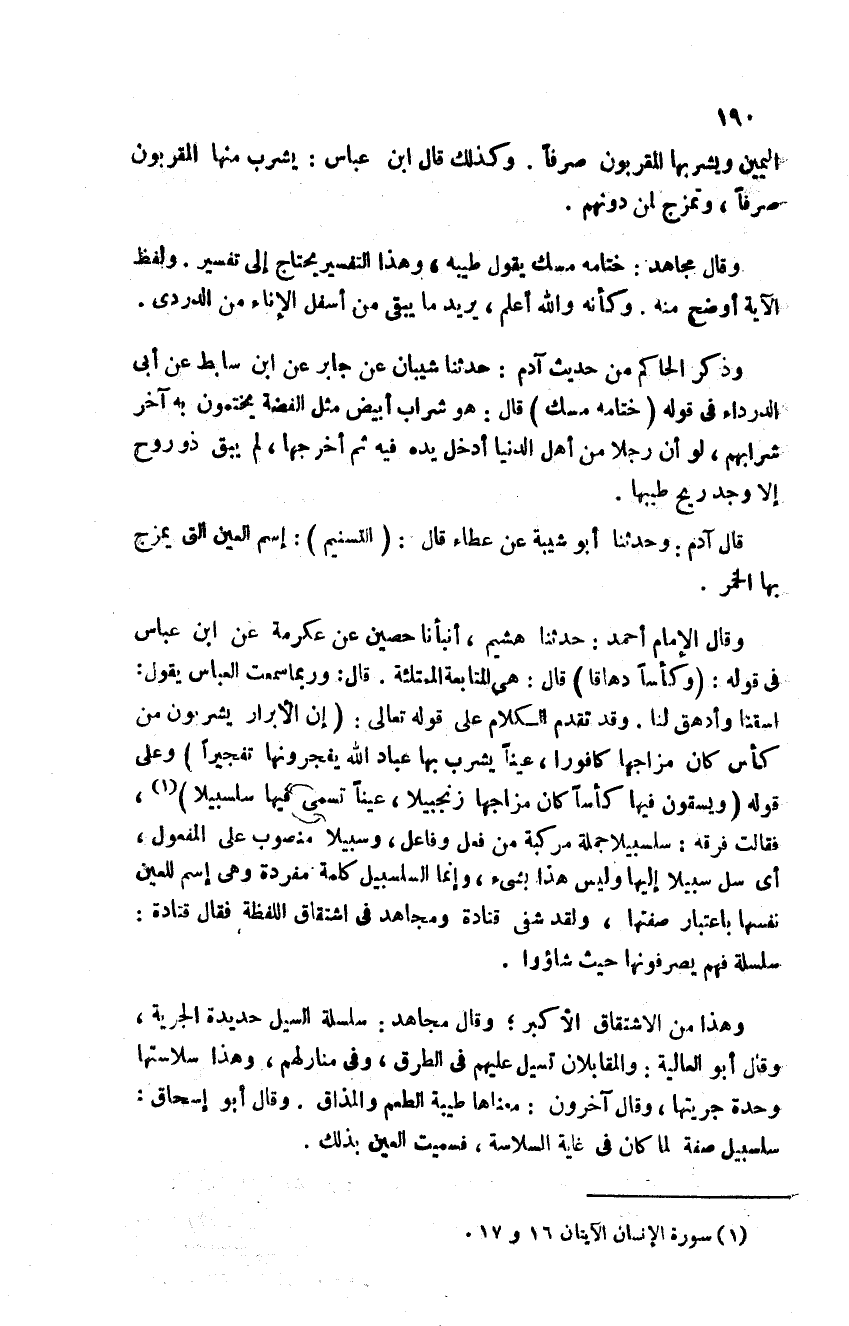قال آدم: وحدثنا أبو شيبة عن عطاء قال: "التسنيم اسم العين التي يمزج بها الخمر"