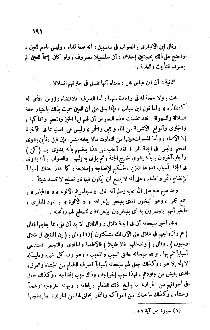 قلت ولا حجة له في واحدة منهما أما الصرف فلا اقتضاء رؤوس الآي له كنظائره وأما قول ابن عباس فإنما يدل على أن العين سميت بذلك باعتبار صفة السلاسة والسهولة فقد تضمنت هذه النصوص أن لهم فيها الخبز واللحم والفاكهة والحلوى وأنواع الأشربة من الماء واللبن والخمر وليس في الدنيا مما في الآخرة إلا الأسماء وأما المسميات فبينها من التفاوت ما لا يعلمه البشر فإن قيل: فأين يشوي اللحم وليس في الجنة نار فقد أجاب عن هذا بعضهم بأنه يشوي بـ: "كن" وأجاب آخرون: بأنه يشوى خارج الجنة ثم يؤتي به إليهم والصواب: أنه يشوى في الجنة بأسباب قدرها العزيز الحكيم لإنضاجه وإصلاحه كما قدر هناك أسبابا لإنضاج الثمر والطعام على أنه لا يمتنع أن يكون فيها نار تصلح لا تفسد شيئا