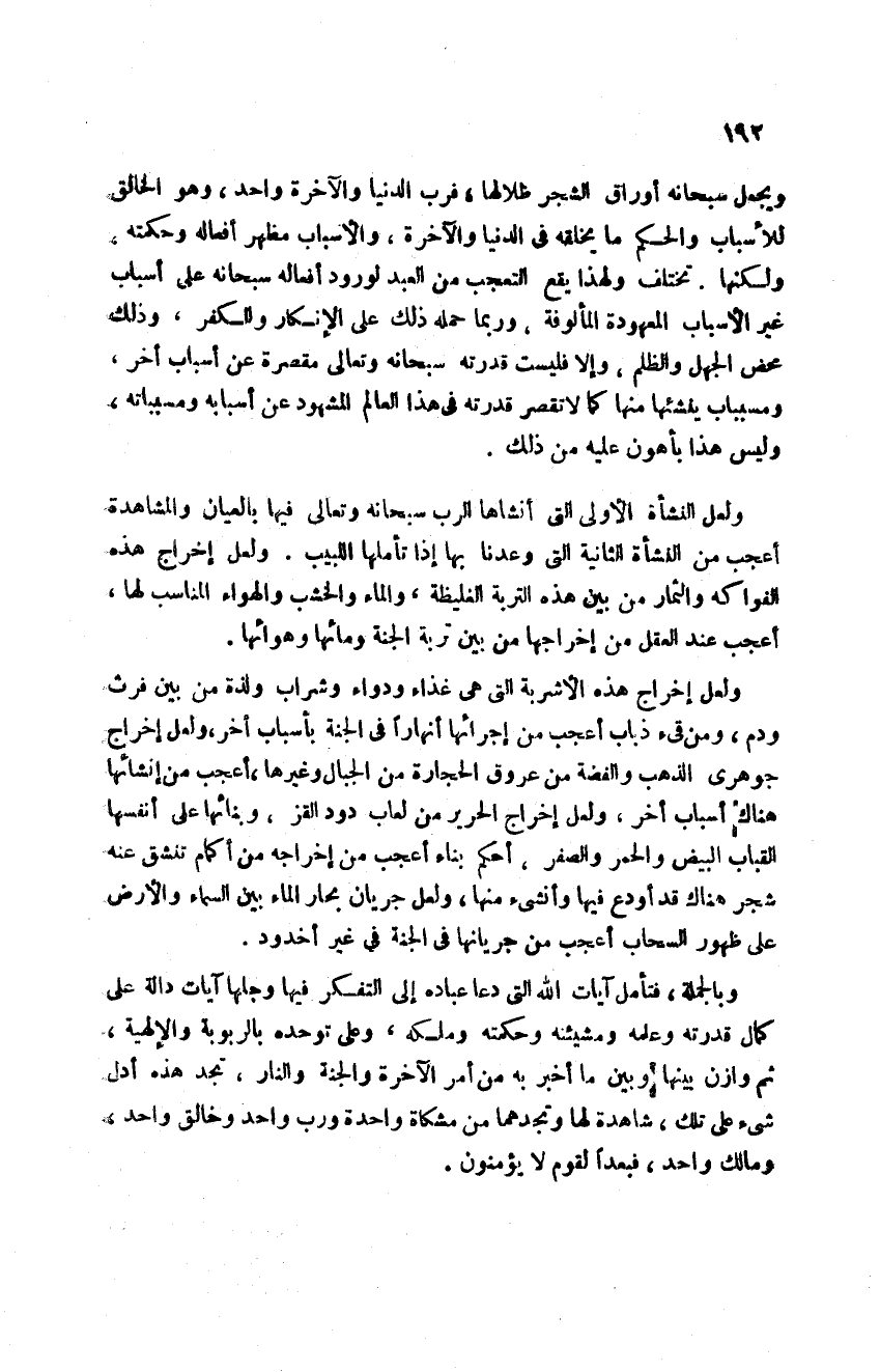 ولعل إخراج هذه الأشربة التي هي غذاء ودواء وشراب ولذة من بين فرث ودم ومن قيء ذباب أعجب من إجرائها أنهارا في الجنة بأسباب أخر ولعل إخراج جوهري الذهب والفضة من عروق الحجارة من الجبال وغيرها أعجب من إنشائها هناك من أسباب أخر ولعل إخراج الحرير من لعاب دودة القز وبنائها على أنفسها القباب البيض والحمر والصفر أحكم بناء أعجب من إخراجه من أكمام تنشق عنه شجر هناك قد أودع فيها وأنشئ منها ولعل جريان بحار الماء بين السماء والأرض على ظهور السحاب أعجب من جريانها في الجنة في غير أخدود.