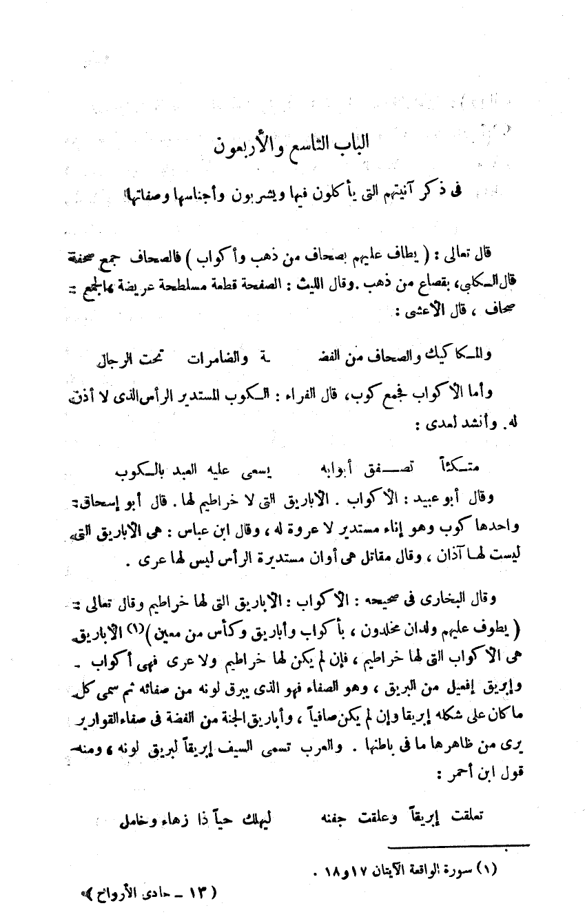 وقال أبو عبيد الأكواب الأباريق التي لا خراطيم لها قال أبو إسحاق وإحدها كوب وهو إناء مستدير لا عروة له وقال ابن عباس هي الأباريق التي ليست لها آذان وقال مقاتل هي أوان مستديرة الرأس ليس لها عرى وقال البخاري في صحيحه الأكواب والأباريق التي لها خراطيم وقال تعالى: {يَطُوفُ عَلَيْهِمْ وِلْدَانٌ مُخَلَّدُونَ بِأَكْوَابٍ وَأَبَارِيقَ وَكَأْسٍ مِنْ مَعِينٍ} الأباريق هي الأكواب التي لها خراطيم فإن لم يكن لها خراطيم ولا عرى فهي أكواب وإبريق إفعيل من البريق وهو الصفاء فهو الذي يبرق لونه من صفائه ثم سمى كل ما كان علىشكله إبريقا وإن لم يكن صافيا وأباريق الجنة من الفضة في صفاء القوارير يرى من ظاهرها ما في باطنها والعرب تسمي السيف إبريقا لبريق لونه ومنه قول ابن أحمر: