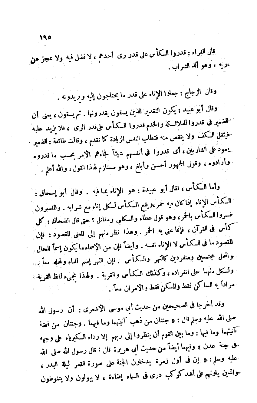 قال الفراء: قدروا الكأس على قدر ريِّ أحدهم لا فضل فيه ولا عجز عن ريه وهو ألذ الشراب