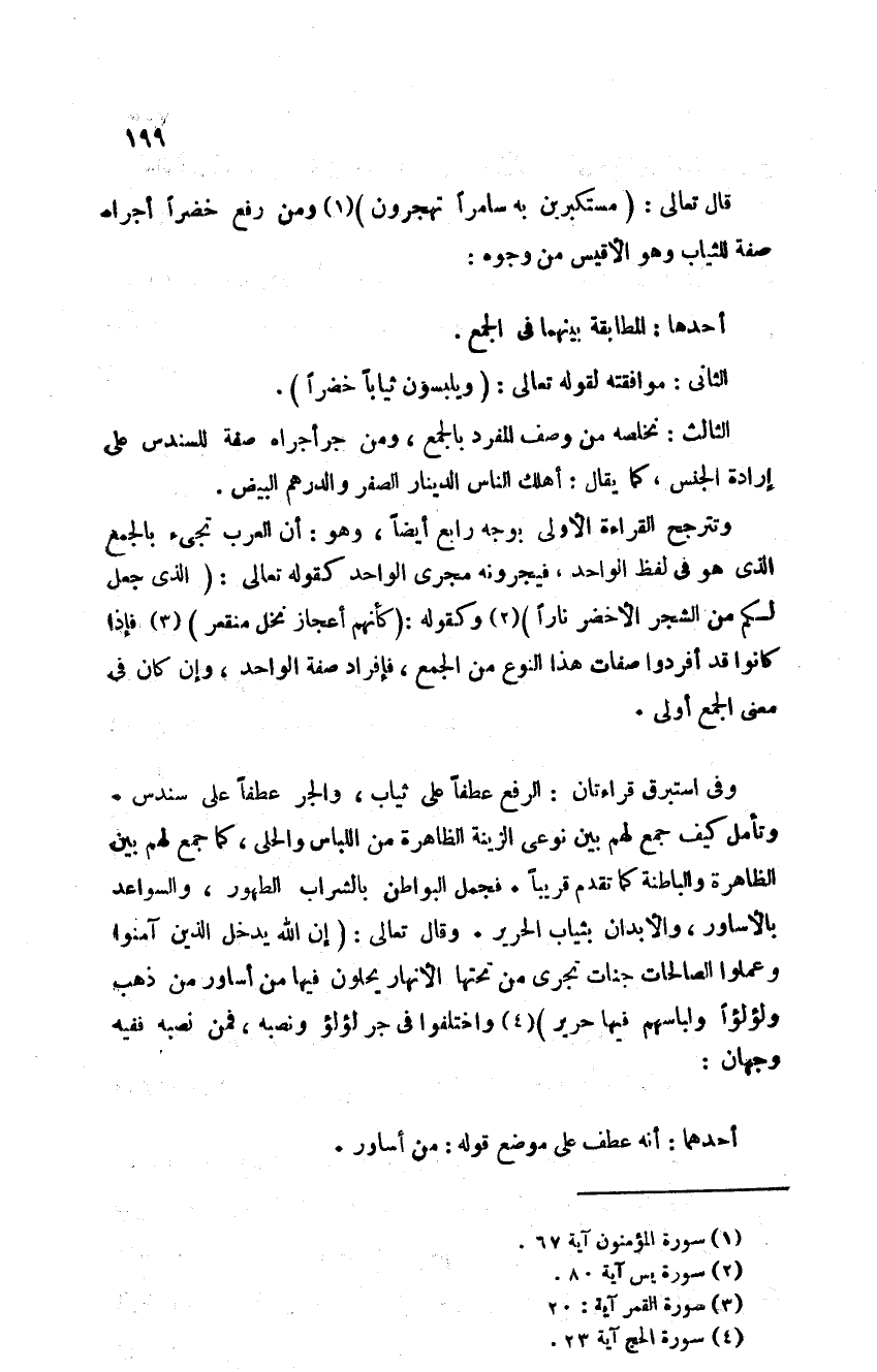 وقال تعالى: {مُسْتَكْبِرِينَ بِهِ سَامِراً تَهْجُرُونَ} ومن رفع خضرا أجراه صفة للثياب وهو الأقيس من وجوه: