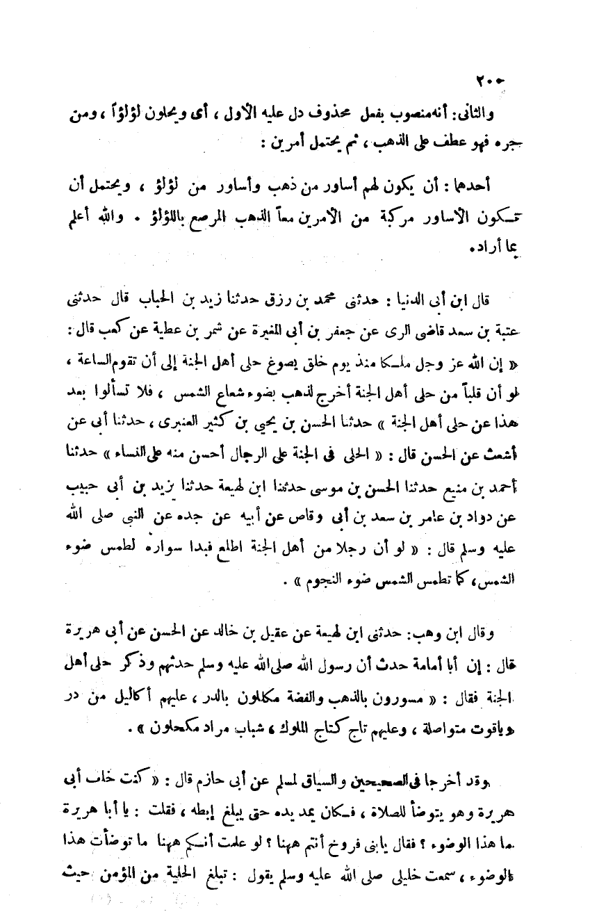 قال ابن أبي الدنيا: حدثني محمد بن رزق حدثنا زيد بن الحباب قال حدثني عتبة بن سعد قاضي الري عن جعفر بن أبي المغيرة عن شمر بن عطية عن كعب قال: "أن لله عز وجل ملكا منذ يوم خلق يصوغ حلي أهل الجنة إلى أن تقوم الساعة لو أن قلبا من حلي أهل الجنة أخرج لذهب بضوء شعاع الشمس فلا تسألوا بعد هذا عن حلي أهل الجنة" حدثنا الحسن بن يحيى بن كثير العنبري حدثنا أبي عن أشعث عن الحسن قال: "الحلي في الجنة على الرجال أحسن منه على النساء"