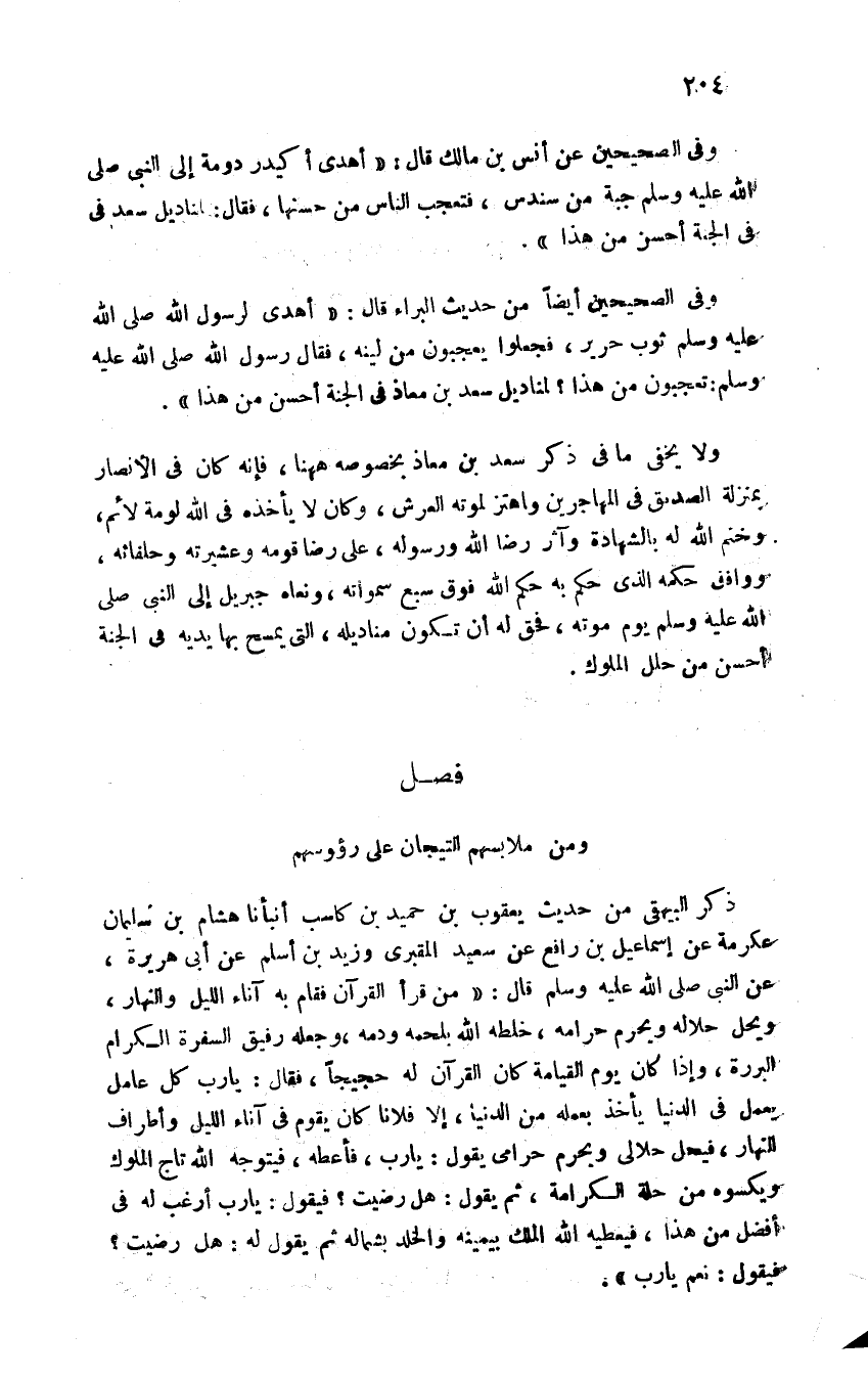 وفي الصحيحين أيضا من حديث البراء قال: أهدي لرسول الله ثوب حرير فجعلوا يعجبون من لينه فقال رسول الله (تعجبون من هذا لمناديل سعد ابن معاذ في الجنة أحسن من هذا".