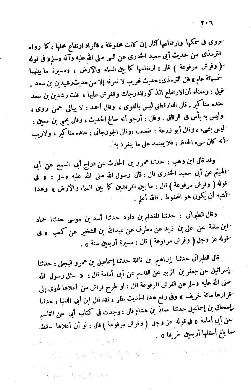 روى في سمكها وارتفاعها آثار إن كانت محفوظة فالمرد ارتفاع محلها كما رواه الترمذي من حديث أبي سعيد الخدري عن النبي صلى الله عليه وسلم في قوله وفرش مرفوعة قال ارتفاعها كما بين السماء والأرض ومسيرة ما بينهما خمسمائة عام قال الترمذي حديث غريب لا نعرفه إلا من حديث رشدين بن سعد قيل ومعناه إن ارتفاع المذكور للدرجات والفرش عليها قلت رشدين بن سعد عنده مناكير: قال الدارقطني: ليس بالقوي وقال أحمد: لا يبالي عمن روى وليس به باس في الرقاق وقال أرجو أنه صالح الحديث, وقال يحيى بن معين: ليس بشيء وقال أبو زرعة: ضعيف وقال الجوزجاني عنده مناكير ولا ريب أنه كان سيء الحفظ فلا يعتمد على ما ينفرد به
