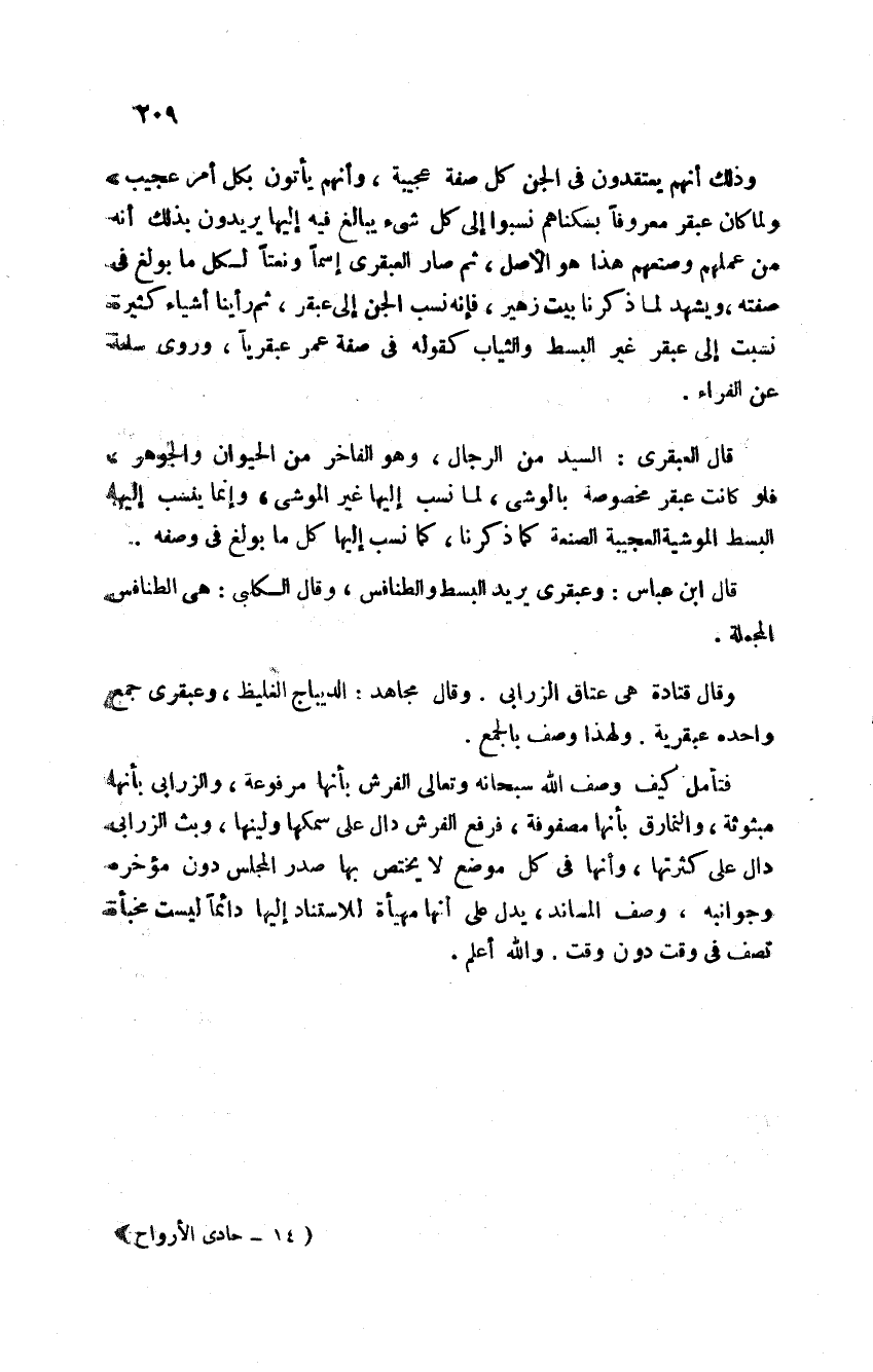 وذلك أنهم يعتقدون في الجن كل صفة عجيبة وأنهم يأتون بكل أمر عجيب ولما كان عبقر معروفا بسكناهم نسبوا كل شيء يبالغ فيه إليها يريدون بذلك أنه من عملهم وصنعهم هذا هو الأصل ثم صار العبقري اسما ونعتا لكل ما بولغ في صفته ويشهد لما ذكرنا بيت زهير فإنه نسب الجن إلى عبقر ثم رأينا أشياء كثيرة نسبت إلى عبقر غير البسط والثياب كقوله في صفة عمر عبقريا وروى سلمة عن الفراء قال العبقري السيد من الرجال وهو الفاخر من الحيوان والجوهر فلو كانت عبقر مخصوصة بالوشى لما نسب إليها غير الموشى وإنما ينسب إليها البسط الموشية العجيبة الصنعة كما ذكرنا كما نسب إليها كل ما بولغ في وصفة