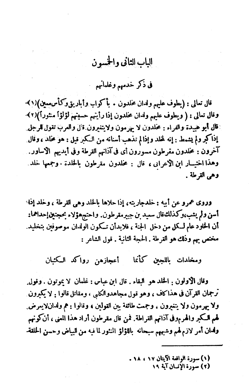 قال تعالى: {يَطُوفُ عَلَيْهِمْ وِلْدَانٌ مُخَلَّدُونَ بِأَكْوَابٍ وَأَبَارِيقَ وَكَأْسٍ مِنْ مَعِينٍ} وقال تعالى: {وَيَطُوفُ عَلَيْهِمْ وِلْدَانٌ مُخَلَّدُونَ إِذَا رَأَيْتَهُمْ حَسِبْتَهُمْ لُؤْلُؤاً مَنْثُوراً} قال أبو عبيدة والفراء: مخلدون لا يهرمون ولا يتغيرون قال والعرب تقول للرجل إذا كبر ولم يشمط أنه لمخلد وإذا لم تذهب أسنانه من الكبر قيل هو مخلد وقال آخرون مخلدون مقرطون مسورون أي في آذانهم القرطة وفي أيديهم الأساور وهذا اختيار ابن الأعرابي قال مخلدون مقرطون بالخلدة وجمعها خلد وهي القرطة