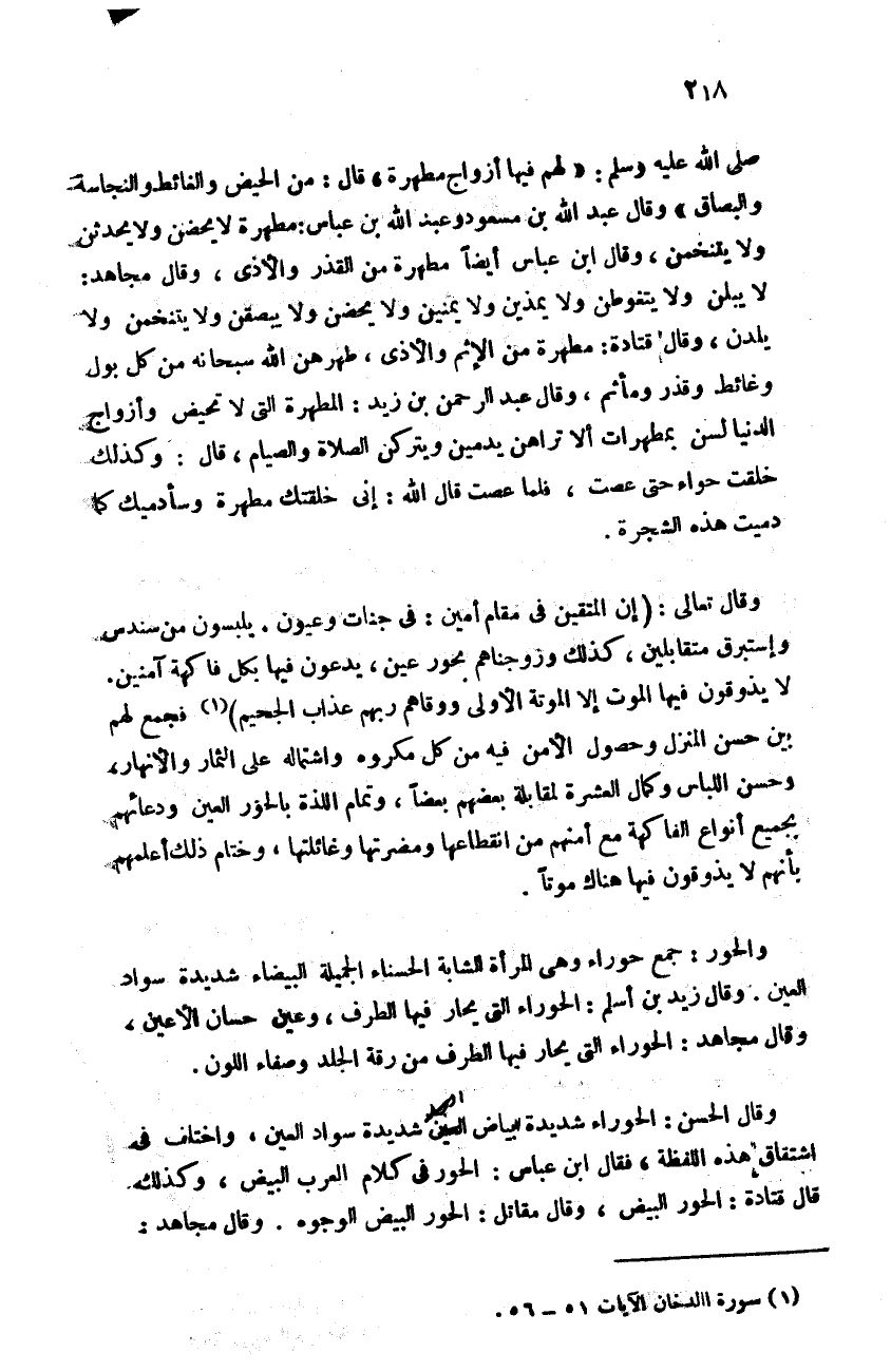 صلى الله عليه وسلم {لَهُمْ فِيهَا أَزْوَاجٌ مُطَهَّرَةٌ} قال من الحيض والغائط والنخامة والبصاق وقال عبد الله بن مسعود وعبد الله بن عباس مطهرة لا يحضن ولا يحدثن ولا يتنخمن وقال ابن عباس أيضا مطهرة من القذر والأذى وقال مجاهد لا يبلن ولا يتغوطن ولا يمذين ولا يمنين ولا يحضن ولا يبصقن ولا يتنخمن ولا يلدن وقال قتادة مطهرة من الإثم والأذى طهرهن الله سبحانه من كل بول وغائط وقذر ومأثم وقال عبد الرحمن بن زيد المطهرة التي لا تحيض وأزواج الدنيا لسن بمطهرات ألا تراهن يدمين ويتركن الصلاة والصيام