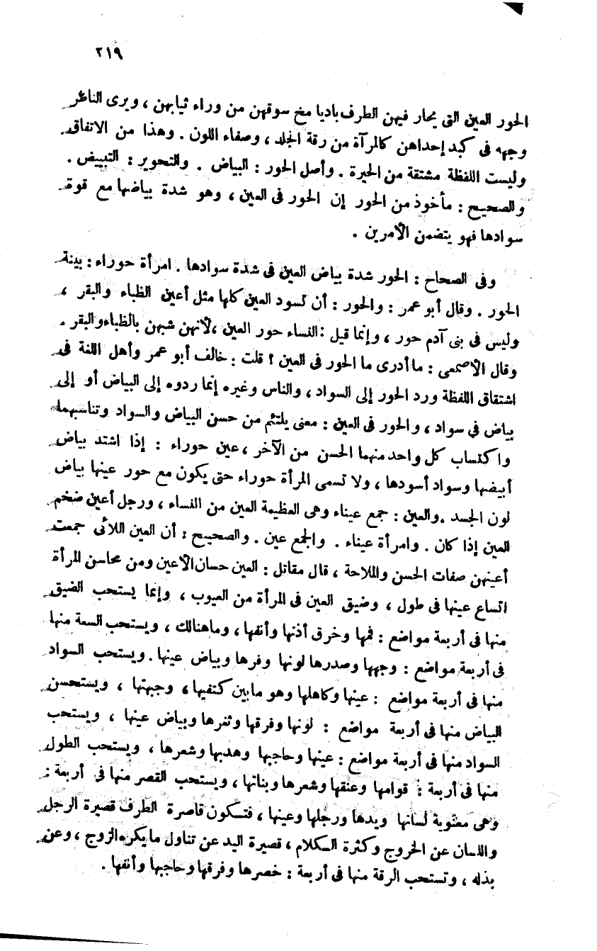 وفي الصحاح الحور شدة بياض العين في شدة سوادها امرأة حوراء بينة الحور وقال أبو عمرو الحور أن تسود العين كلها مثل أعين الظباء والبقر وليس في بني آدم حور وإنما قيل للنساء حور العين لأنهن شبهن بالظباء والبقر وقال الأصمعي ما أدري ما الحور في العين قلت خالف أبو عمرو أهل اللغة في اشتقاق اللفظة ورد الحور إلى السواد والناس غيره إنما ردوه إلى البياض أو إلى بياض في سواد والحور في العين معنى يلتئم من حسن البياض والسواد وتناسبهما واكتساب كل واحد منهما الحسن من الآخر عين حوراء إذا اشتد بياض أبيضها وسواد أسودها ولا تسمى المرأة حوراء حتى يكون مع حور عينها بياض لون الجسد والعين جمع عيناء وهي العظيمة العين من النساء ورجل أعين إذا كان ضخم العين وامرأة عيناء والجمع عين والصحيح أن العين اللاتي جمعت أعينهن صفات الحسن والملاحة قال مقاتل العين حسان الأعين ومن محاسن المرأة اتساع عينها في طول وضيق العين في المرأة من العيوب وإنما يستحب الضيق منها في أربعة مواضع فيها وخرق أذنها وانفها وما هنالك ويستحب السعة منها في أربعة مواضع ووجهها وصدرها وكاهلها وهو ما بين كتفيها وجبهتها ويستحسن البياض منها في أربعة مواضع لونها وفرقها وثغرها وبياض عينها ويستحب السواد منها في أربعة مواضع عينها وحاجبها وهدبها وشعرها