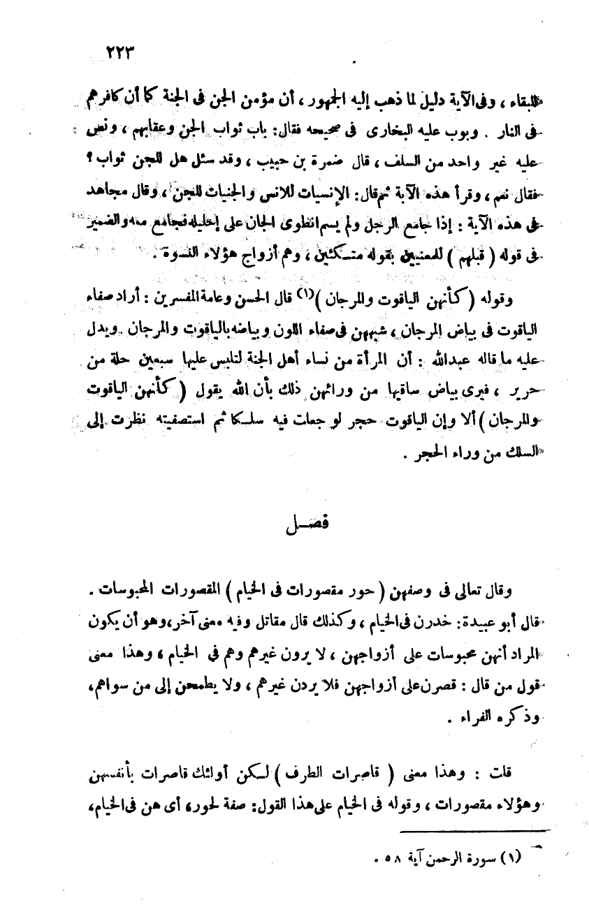 وقال تعالى: في وصفهن: {حُورٌ مَقْصُورَاتٌ فِي الْخِيَامِ} المقصورات المحبوسات قال أبو عبيدة: خدرن في الخيام وكذلك قال مقاتل: وفيه معنى آخر وهو أن يكون المراد أنهن محبوسات على أزواجهن لا يرون غيرهم وهم في الخيام وهذا معنى قول من قال قصرن على أزواجهن فلا يردن غيرهم ولا يطمحن إلى من سواهم وذكره الفراء