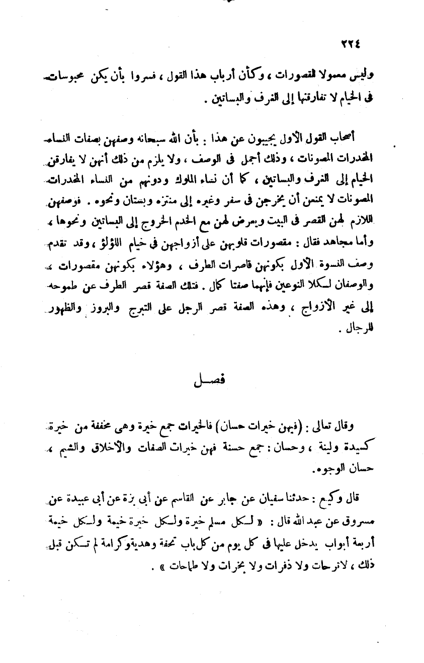 وأصحاب القول الأول يجيبون عن هذا بأن الله سبحانه وصفهن بصفات النساء المخدرات المصونات وذلك أجمل في الوصف ولا يلزم من ذلك أنهن لا يفارقن الخيام إلى الغرف والبساتين كما أن نساء الملوك ودونهم من النساء المخدرات المصونات لا يمنعن أن يخرجن في سفر وغيره إلى منتزه وبستان ونحوه فوصفهن اللازم لهن القصر في البيت ويعرض لهن مع الخدم الخروج إلى البساتين ونحوها وأما مجاهد فقال: مقصورات قلوبهن على أزواجهن في خيام اللؤلؤ وقد تقدم وصف النسوة الأول بكونهن قاصرات الطرف وهؤلاء بكونهن مقصورات والوصفان لكلا النوعين فإنهما صفتا كمال فتلك الصفة قصر الطرف عن طموحه إلى غير الأزواج وهذه الصفة قصر الرجل على التبرج والبروز والظهور
