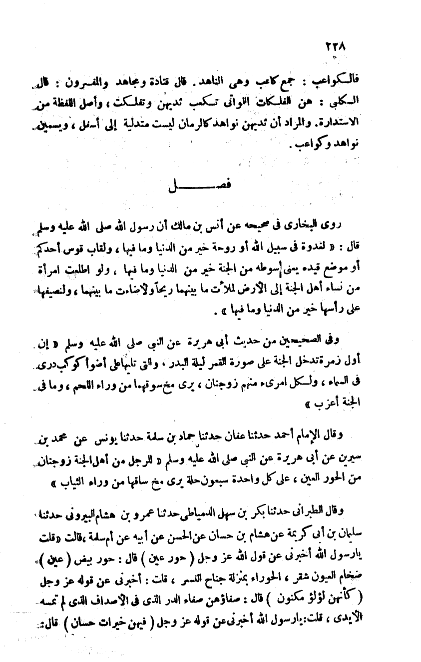 روى البخاري في صحيحه عن أنس بن مالك أن رسول الله صلى الله عليه وسلم قال: "لغدوة في سبيل الله أو روحة خير من الدنيا وما فيها ولقاب قوس أحدكم أو موضع قيده يعني سوطه من الجنة خير من الدنيا وما فيها ولو اطلعت امرأة من نساء أهل الجنة إلى الأرض لملأت ما بينهما ريحا ولأضاءت ما بينهما ولنصيفها على رأسها خير من الدنيا وما فيها"