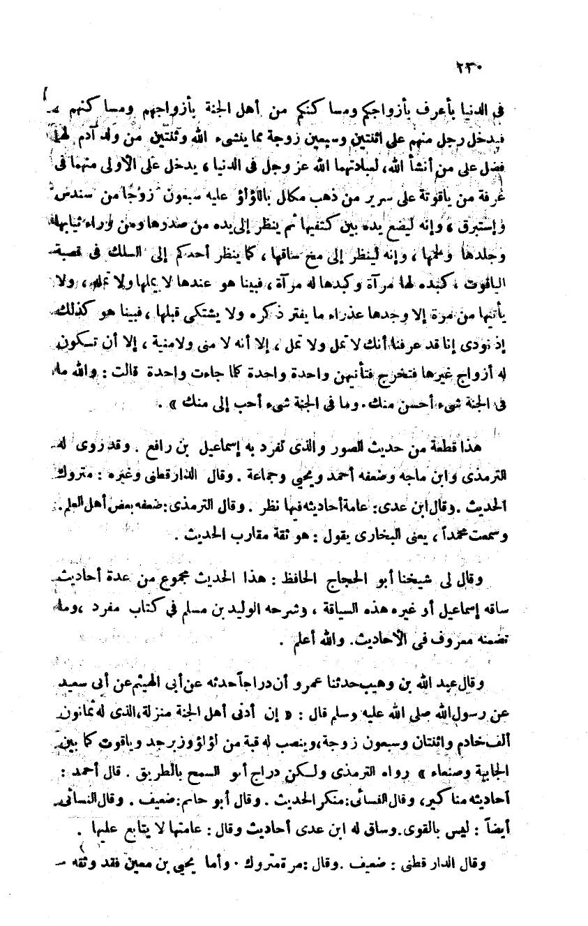 وقال عبد الله بن وهب حدثنا عمرو أن دراجا حدثه عن أبي الهيثم عن أبي سعيد عن رسول الله صلى الله عليه وسلم قال: "إن أدنى أهل الجنة منزلة الذي له ثمانون ألف خادم واثنتان وسبعون زوجة وينصب له قبة من لؤلؤ وزبرجد وياقوت كما بين الجابية وصنعاء" رواه الترمذي ولكن دراج أبو السمح بالطريق قال احمد أحاديث مناكير وقال النسائي منكر الحديث ضعيف وقال أيضا ليس بالقوة وساق له ابن عدي أحاديث وقال عامتها لا يتابع عليها وقال الدارقطني ضعيف وقال مرة متروك وأما يحيى بن معين فقد وثقه