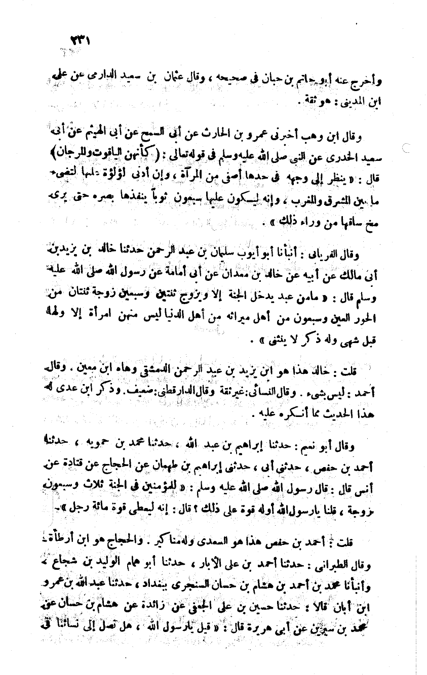 قلت: احمد بن حفص هذا هو السعدي وله مناكير والحجاج هو ابن أرطاة وقال الطبراني حدثنا احمد بن علي الأبار حدثنا أبو همام الوليد بن شجاع وأنبانا محمد بن احمد بن هشام بن حسان السنجري ببغداد حدثنا عبد الله بن عمرو بن أبان قالا حدثنا حسين بن علي الجعفي عن زائدة عن هشام بن حسان عن محمد بن سيرين عن أبي هريرة رضي الله عنه قال: قيل يا رسول الله صلى الله عليه وسلم هل نصل إلى نسائنا