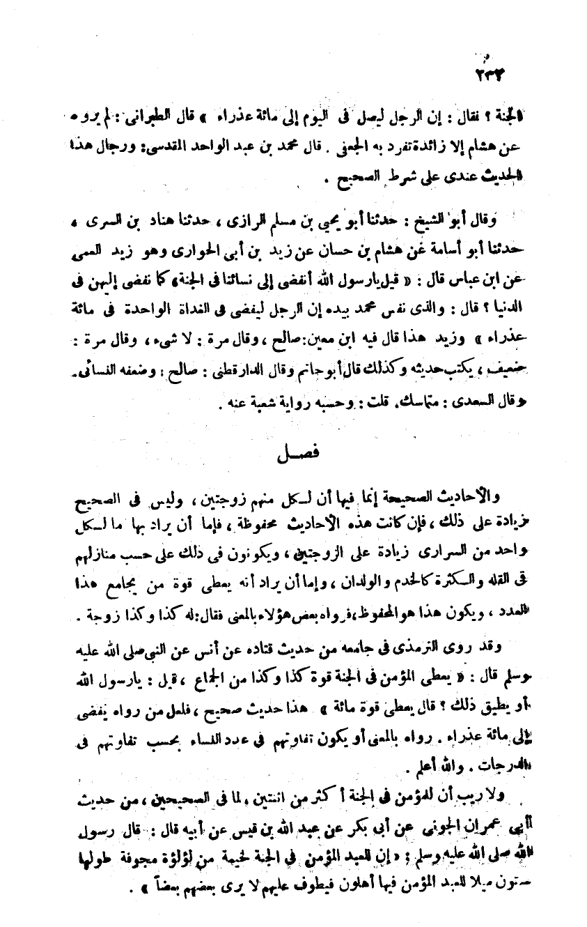 وقال أبو الشيخ حدثنا أبو يحيى بن مسلم الرازي حدثنا هناد بن السرى حدثنا أبو أسامة عن هشام بن حسان عن يزيد بن أبي الحواري وهو زيد العمى عن ابن عباس قال: قيل: يا رسول الله صلى الله عليه وسلم أنفضي إلى نسائنا في الجنة كما نفضي إليهنّ في الدنيا قال: "والذي نفس محمد بيده إن الرجل ليفضي في الغداة الواحدة إلى مائة عذراء" وزيد هذا قال فيه ابن معين صالح وقال مرة: لا شيء وقال مرة ضعيف يكتب حديثه وكذلك قال أبو حاتم وقال الدارقطني صالح وضعفه النسائي قال السعدي متماسك قلت: وحسبه رواية شعبة عنه