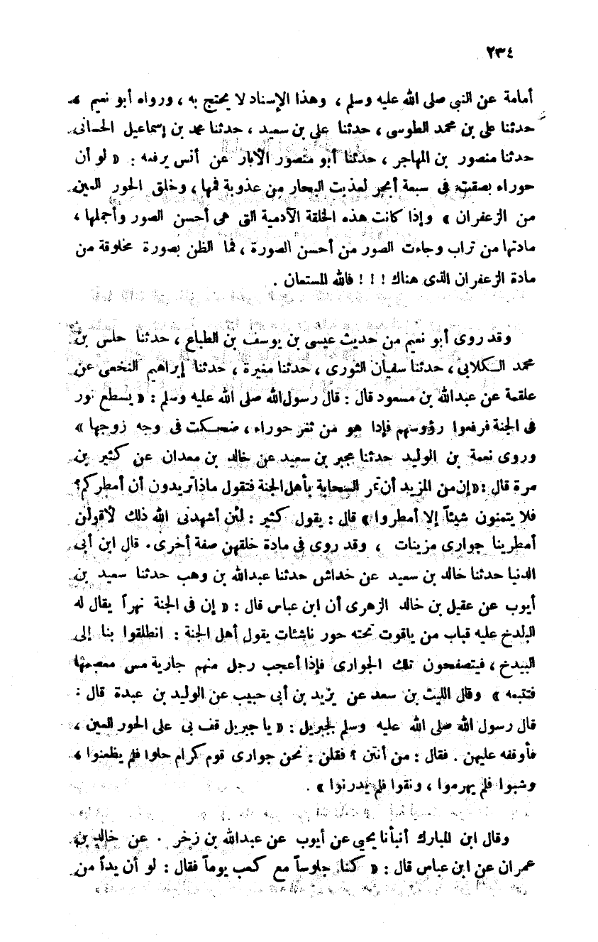 وقد روى أبو نعيم من حديث عيسى بن يوسف بن الطباع حدثنا حلس بن محمد الكلابي حدثنا سفيان الثوري حدثنا مغيرة حدثنا إبراهيم النخعي عن علقمة عن عبد الله بن مسعود قال: قال رسول الله صلى الله عليه وسلم: "يسطع نور في الجنة فرفعوا رؤوسهم فإذا هو من ثغر حوراء ضحكت في وجه زوجها" روى نعمة بن الوليد حدثنا مجبر بن سعيد عن خالد بن معدان عن كثير بن مرة قال: "إن من المزيد من تمر السحابة بأهل الجنة فتقول ماذا تريدون أن أمطركم فلا يتمنون شيئا إلا أمطروا" قال: يقول كثير: لئن أشهدني الله ذلك لأقولن أمطرينا جواري مزينات وقد روى في مادة خلقهن صفة أخرى قال ابن أبي الدنيا حدثنا خالد بن سعيد عن خداش حدثنا عبد الله بن وهب حدثنا سعيد بن أيوب عن عقيل بن خالد عن الزهري أن ابن عباس قال: إن في الجنة نهرا يقال له البيدخ عليه قباب من ياقوت تحته حور ناشئات يقول أهل الجنة انطلقوا بنا إلى البيدخ فيجيئون فيتصفحون تلك الحواري فإذا أعجب رجل منهم جارية مس معصمها فتتبعه وقال الليث بن سعد عن يزيد بن أبي حبيب عن الوليد بن عبدة قال: قال: رسول الله صلى الله عليه وسلم لجبريل يا جبريل: "قف بي على الحور العين" فأوقفه عليهن فقال: "من أنتن" فقلنا: نحن حواري قوم كرام حلوا فلم يظعنوا شبوا فلم يهرموا ونقوا فلم يدرنوا"